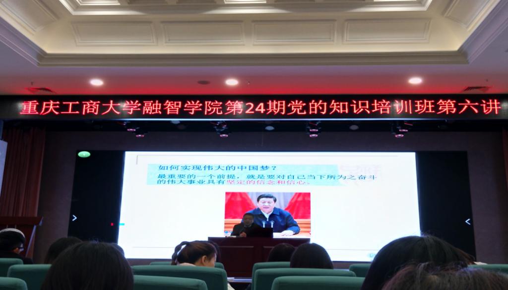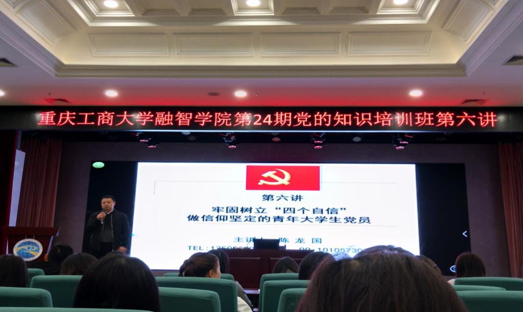 11月8日中午12:40,重庆工商大学融智学院第24期党的知识培训班第六讲在学术报告厅顺利举行。重庆工商大学融智学院党委副书记陈龙国副教授以“牢固树立‘四个自信’,做信仰坚定的青年大学生党员”为题,为全体学员展开了“牢固树立‘四个自信’,做信仰坚定的青年大学生党员”的专题党课。
