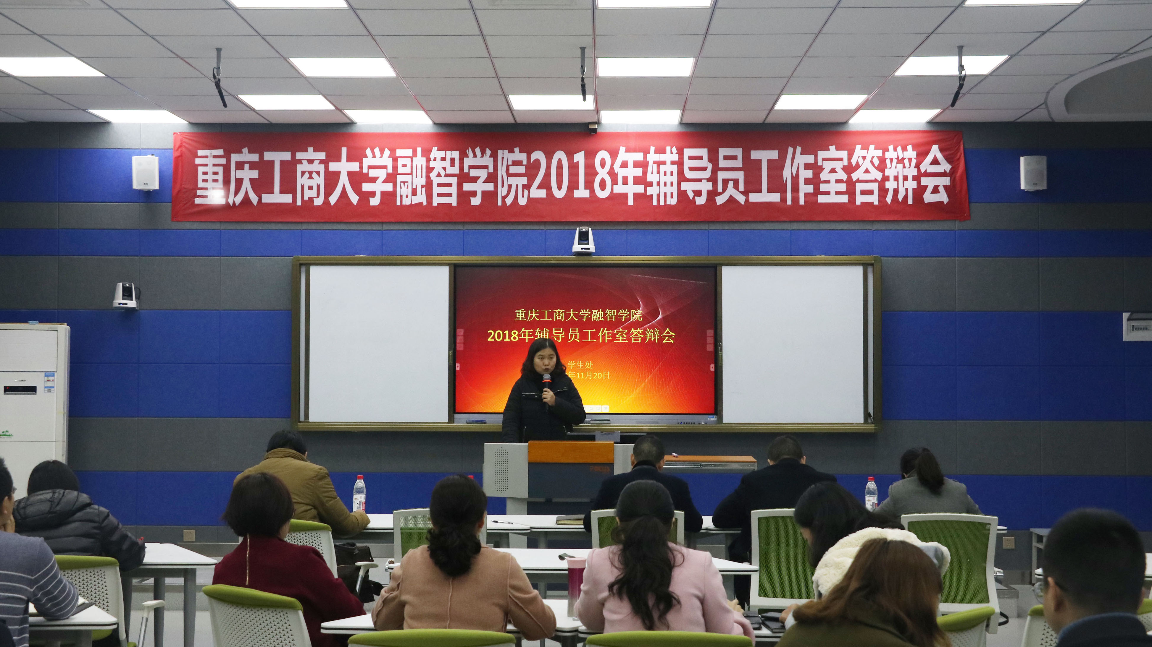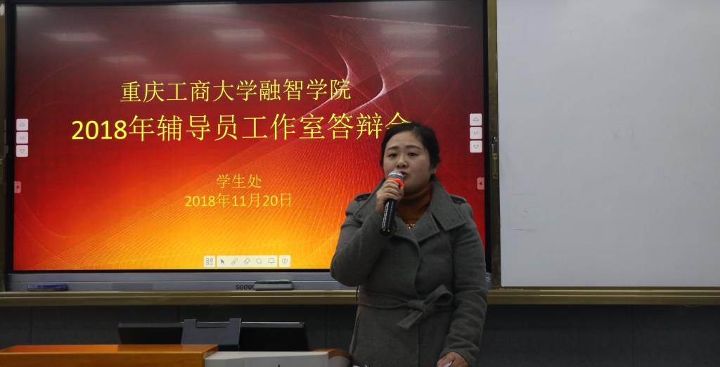 11月20日14:30我校在教学楼1220教室举行2018年辅导员工作室答辩会。重庆社会科学院改革杂志社副总编辑文丰安教授、重庆工商大学副高级辅导员谭彩和老师、学校党委副书记陈龙国、思政部陈开江副教授和学生处处长唐川川出席本次答辩会并担任评委。答辩会由唐川川主持。
