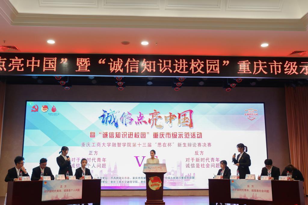 本次活动分为三个阶段,第一阶段为“诚信点亮中国”全国巡回活动(重庆站)暨“诚信知识进校园”市级示范活动;第二阶段为重庆银行渝中管理部开展“诚信知识进校园”情景展示;第三阶段为2018年重庆工商大学融智学院以诚信为主题的辩论赛决赛。