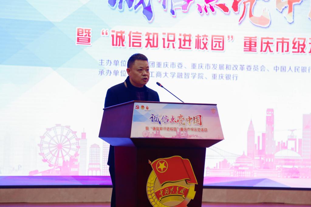 为深入贯彻习近平新时代中国特色社会主义思想和党的十九大精神,不断提升和增强青年的诚信意识和信用理念,积极践行社会主义核心价值观,推进社会信用体系建设,响应团中央号召各级团组织开展2018年“诚信点亮中国”全国巡回活动,由团市委、市发展改革委、人民银行重庆营管部共同主办,重庆工商大学融智学院、重庆银行联合承办的“诚信点亮中国”暨“诚信知识进校园”重庆市级示范活动,于2018年11月22日下午2点半在学术报告厅顺利举行。出席本次活动的领导有团市委党组成员、副书记胡栋、市发改委副巡视员周韶晖、中国人民银行重庆营管部征信管理处业务专员朱平、重庆银行总行个人银行部总经理陆勇、重庆工商大学融智学院副校长沈民、重庆工商大学融智学院党委副书记陈龙国。团市委、市发展改革委、人民银行重庆营管部相关处室(部门)同志、重庆工商大学融智学院部分师生约300人参加了活动。