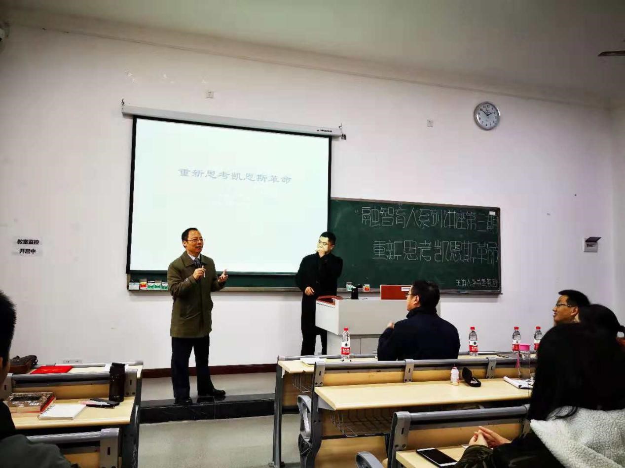 李井奎教授上午的讲座“重新思考凯恩斯革命”主要围绕以下几个论题展开:一、1930年代的经济学界大战;二、维克赛尔联系;三、哈耶克论凯恩斯;四、凯恩斯论哈耶克;五、斯拉法论哈耶克;六、《通论》与哈耶克;七、重新思考凯恩斯革命。首先李井奎教授为现场的师生介绍自己研究凯恩斯理论的缘由,他发现在国内缺少对对凯恩斯理论的研究,这个缺口的弥补将有功千秋万代,正是这种信念支撑着他计划用十年的时间翻译凯恩斯著作,至今已翻译完成七本;其次,利用其雄厚的读书功底,将与凯恩斯相关的零散知识碎片组织成一张网,其中提到宏观经济学核心问题是短期波动与长期经济增长之间的协调问题,而协调机制是利率;凯恩斯与哈耶克三个回合大战,以通俗易懂、生动的语言精彩的呈现给现场的师生,并在讲述的过程中还推荐了相关知识的经典阅读书籍,为师生今后的阅读开辟了捷径;最后,与现场师生互动,讲座人与听众互问互答,相映成趣。