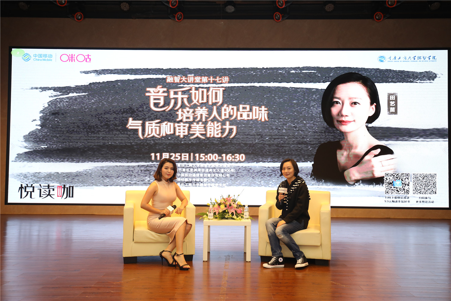 为进一步落实全国学校美育工作会议精神,切实做好美育工作,弘扬中华美育精神,融智大讲堂第十七讲以“音乐如何培养人的品味、气质和审美能力”为主题,举办“2018重庆移动读书会——咪咕·阅读咖田艺苗”专场讲座。讲座于2018年11月25日下午15点在重庆工商大学融智学院学术报告厅顺利举行。本次讲座由上海音乐学院作曲系副教授、青年作曲家、学者、作家田艺苗担任主讲人。