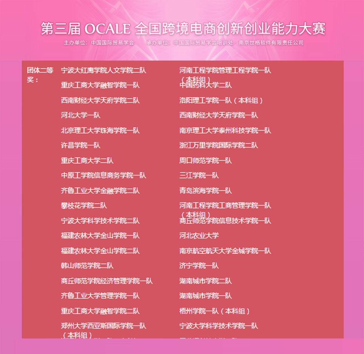 月23日,由中国国际贸易学会主办,中国国际贸易学会培训处、南京世格软件有限公司承办的全国性大型跨境电商专业竞赛“OCALE全国跨境电商创新创业能力大赛”落下帷幕。本次比赛全国共有472支各大高校团队参赛,包含本科组256支团队。本次比赛是商务学院国贸教研室首次组队参赛。从11月20日到11月23日,经过为期四天的在线比赛,我校国贸教研室邓雅娴老师带领的由2016级国际经济与贸易专业六位学生组成的2支队伍喜获佳绩。其中,由李诚诚、牟鑫莉、刘星三位同学组成的一队最终排名28名,荣获全国二等奖;由何李龙、蔡雨箐、文艺澄三位同学组成的二队,最终排名54名,荣获全国二等奖。