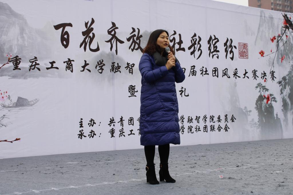 白日不到处,青春恰自来。2018年12月12日中午12:20,社团联合会第四届“百花齐放•社彩缤纷”社团风采大赛决赛暨颁奖典礼在学校足球场顺利举行。本次大赛由共青团重庆工商大学融智学院委员会主办,由重庆工商大学融智学院社团联合会承办。莅临本次大赛的嘉宾有:学生处处长唐川川老师,学生处副处长兼团委书记李刚老师,财富管理学院学团办主任宋钰静老师,商务学院学团办主任徐繁生老师,管理工程学院综合办主任范雪林老师,学生处王玲艳老师,学生处杨惠林老师,学生处李英老师,团委刘艳娇老师以及团委郑旺老师。校社团联合会主席团担任本次大赛的评委。14个晋级的社团在本次决赛中展开了激烈地比拼,校团委、学生会主席团代表、各学院主席团代表、28个社团代表,近300名观众观看了本次大赛。
