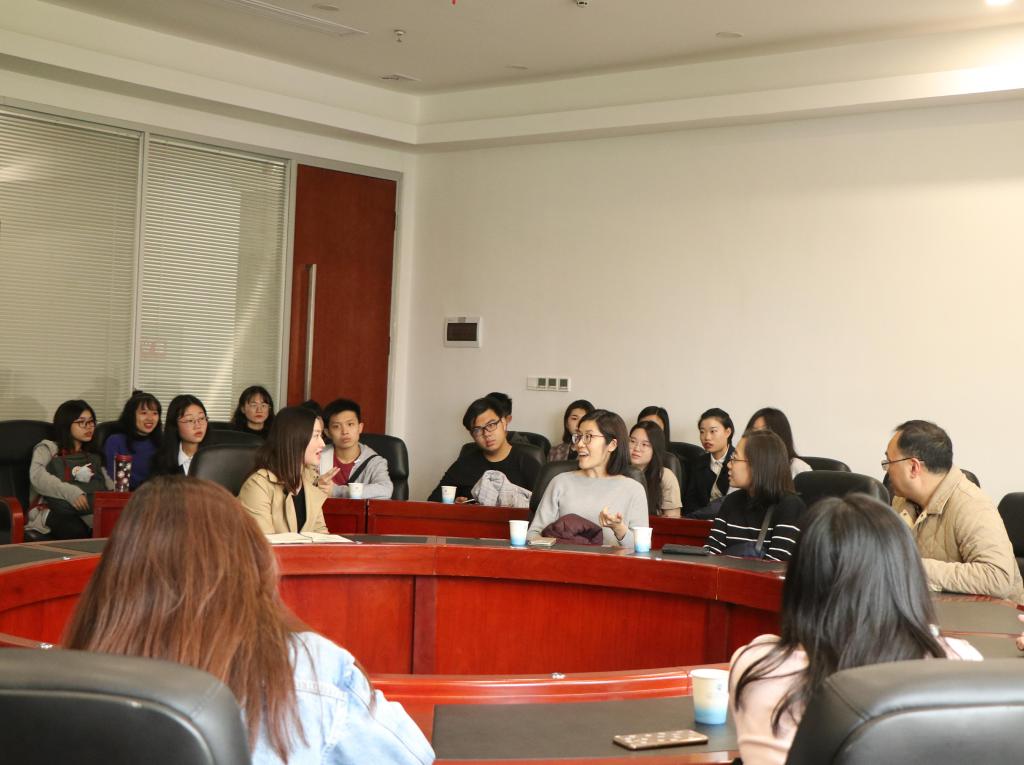 随后,在会计学院院长助理杨瑞丽老师的主持下,双方师生在行政楼2303会议室开展了座谈会。杨瑞丽助理首先向各位嘉宾到访我校表示诚挚欢迎,并简要介绍了我校会计学院专业设置、师资力量和科研成果等。稍后,双方学生就彼此专业课程、实习和实践活动等展开了热烈的讨论。