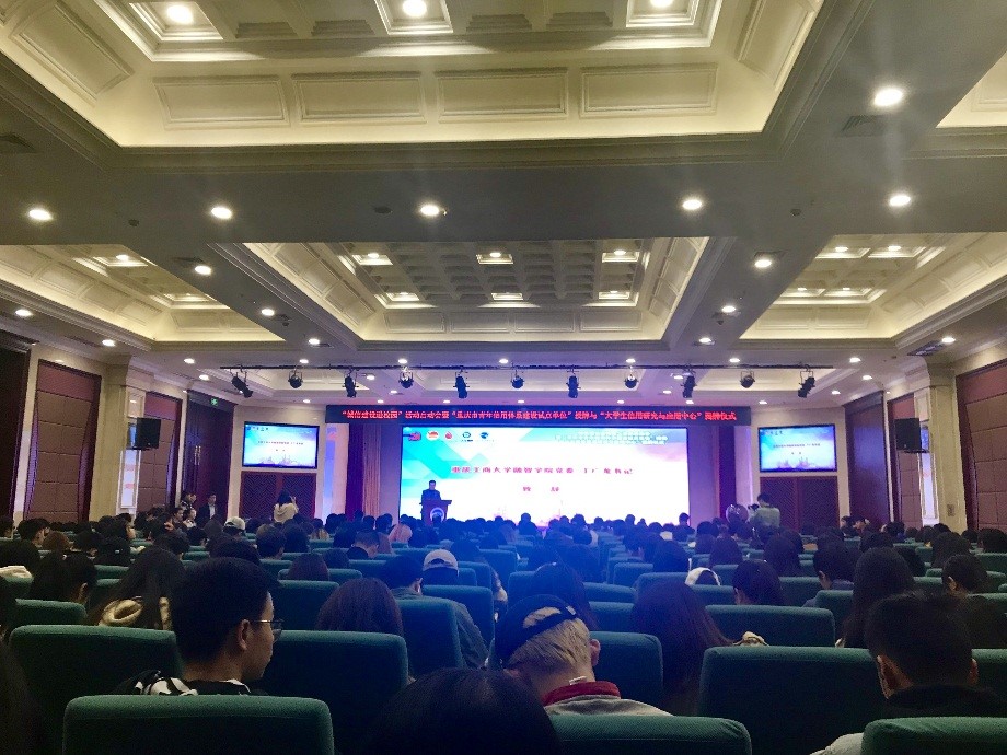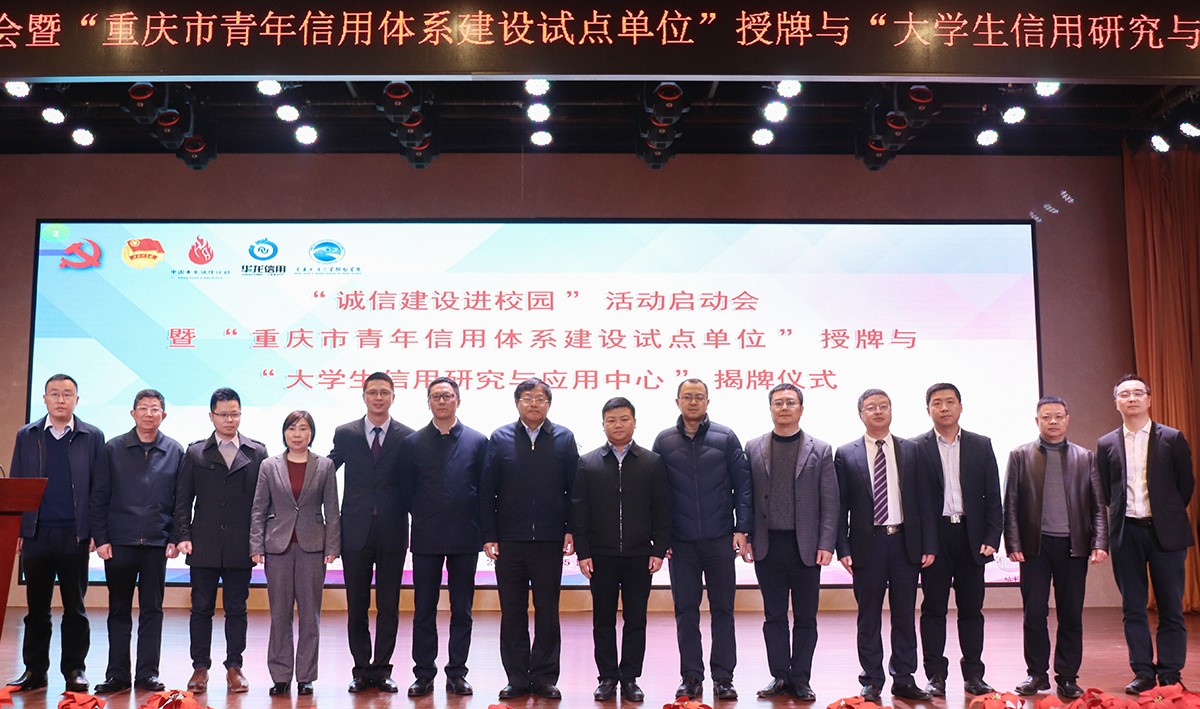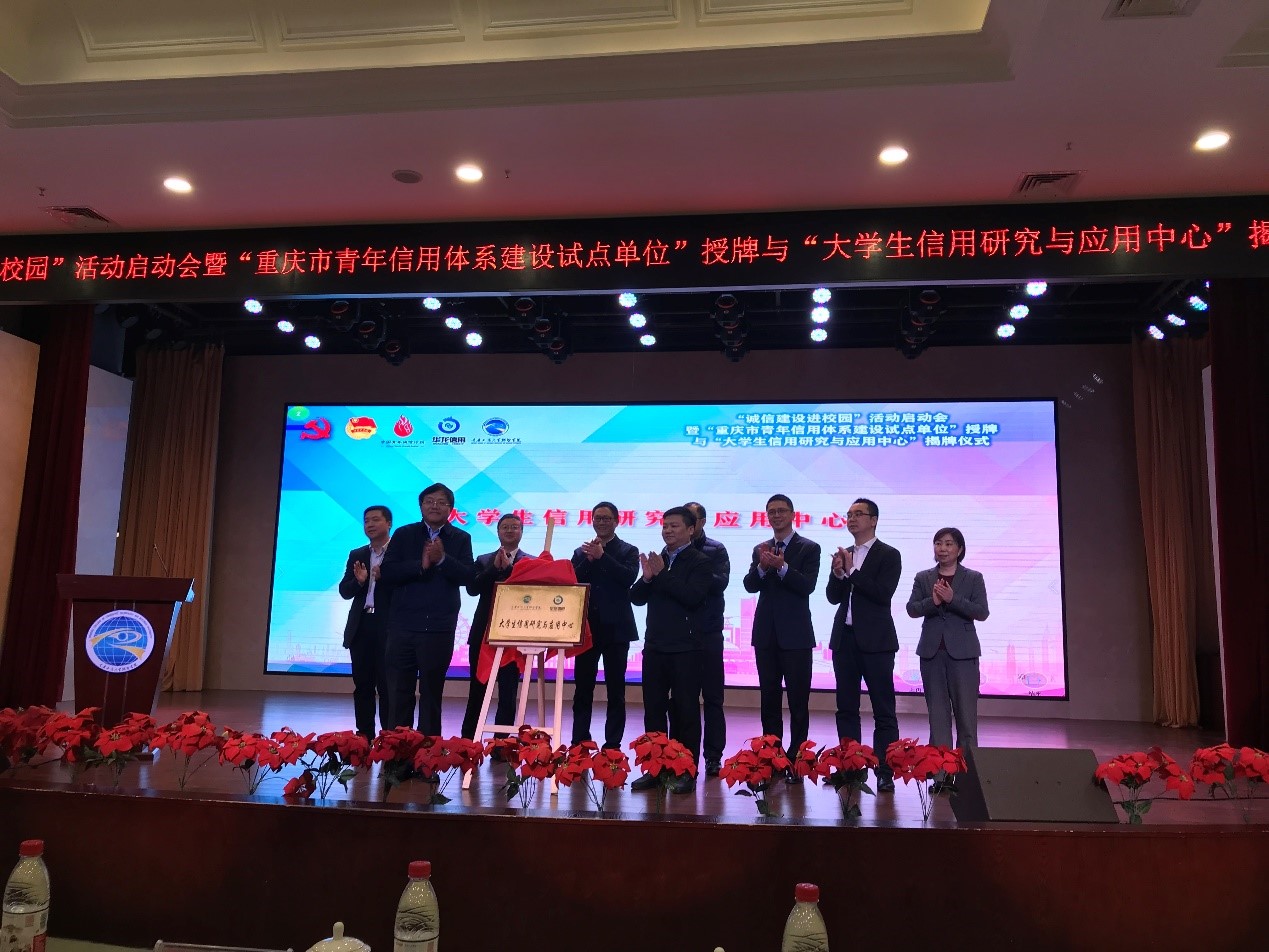 接下来,由团市委党组成员、副书记谭涵之同志为重庆市青年信用体系建设试点单位进行授牌,重庆工商大学融智学院党委副书记陈龙国同志上台接牌。随后,谭涵之副书记、王崇举教授共同为“大学生信用研究与应用中心”揭牌。