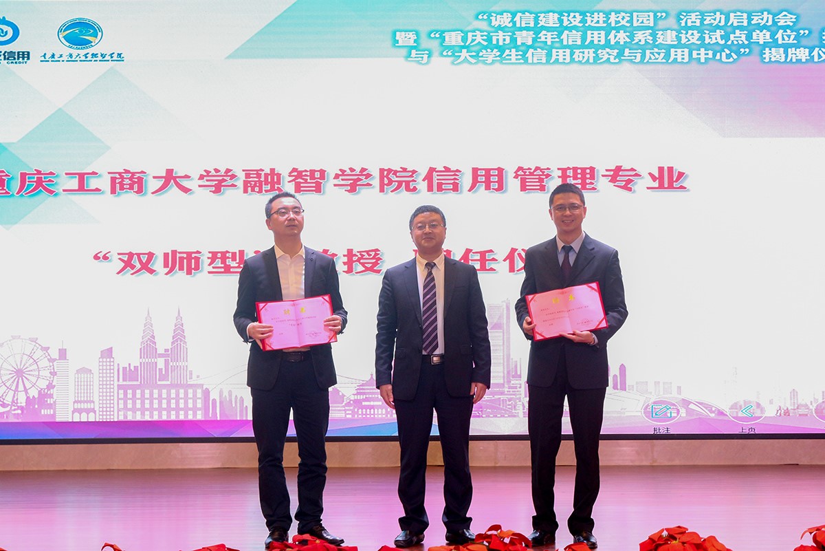 会上,重庆市信用管理龙头企业华龙强渝信用管理公司总经理郑亮致辞并感谢融智学院作为西部地区唯一所开设信用管理专业的高校,为信用工作提供了强有力的人才保障。早在2017年华龙强渝信用管理公司就与融智学院建立了全面的框架合作协议,这开启了重庆市校企联合参与和推进社会信用体系建设的先河,经过在一年多的实践,通过产教融合结合的模式,共建信用管理专业,进行项目合作和科学研发以及应用型人才的定点培养,校外实习就业,取得了一定的成效。郑总表示还会强力与融智学院合作来适应重庆地方经济发展的需要,互利互惠,共同促进和共同推动青年信用体系建设。郑总致辞后,重庆工商大学融智学院常务副校长吴华安教授向华龙强渝信用管理公司总经理郑亮、科大讯飞股份有限公司西南区副总经理杨洋发"双师型"教授、"客座"教授聘书。