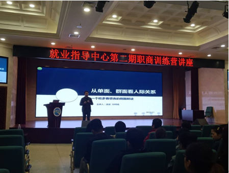 为帮助大学生更好地端正职业态度、提升职业能力、塑造职业气质,澳门新葡京博彩处就业指导中心于2019年4月1日在学术报告厅举办了第二期职商训练营。本期职商训练营特别邀请到中华英才网校园渠道经理凌波先生做了以“ 从单面、群面看人际关系 ”为主题的讲座。