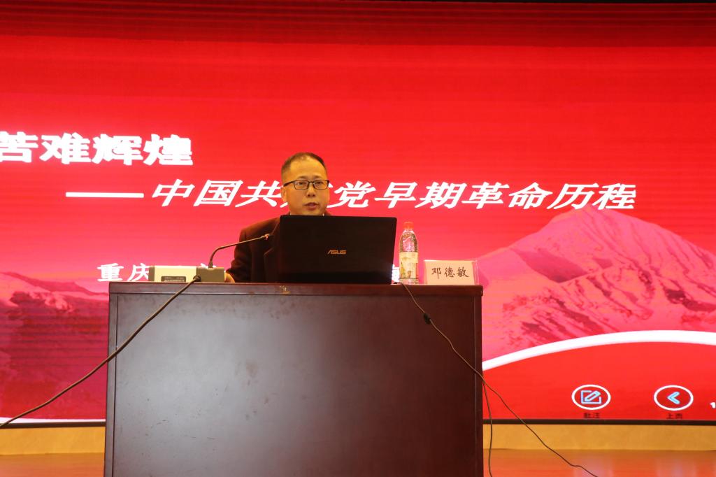 课上,邓德敏教授以“苦难辉煌中国共产党早期革命历程”为题,以“夹缝中生存”,“南昌,南昌”,“浴血长征”为主题展开此次党课学习。他首先带大家回顾中国共产党成立96年以来直到如今21世纪的成就。如今的中国共产党是世界第一大党,可我们切不能忘记我们的起步是从1921年开始。正如习近平总书记所说:“好学才能上进。中国共产党人依靠学习走到今天,也必然要依靠学习走向未来。我们的干部要上进,我们的党要上进,我们的国家要上进,我们的民族要上进,就必须大兴学习之风,坚持学习、学习、再学习,坚持实践、实践、再实践。”