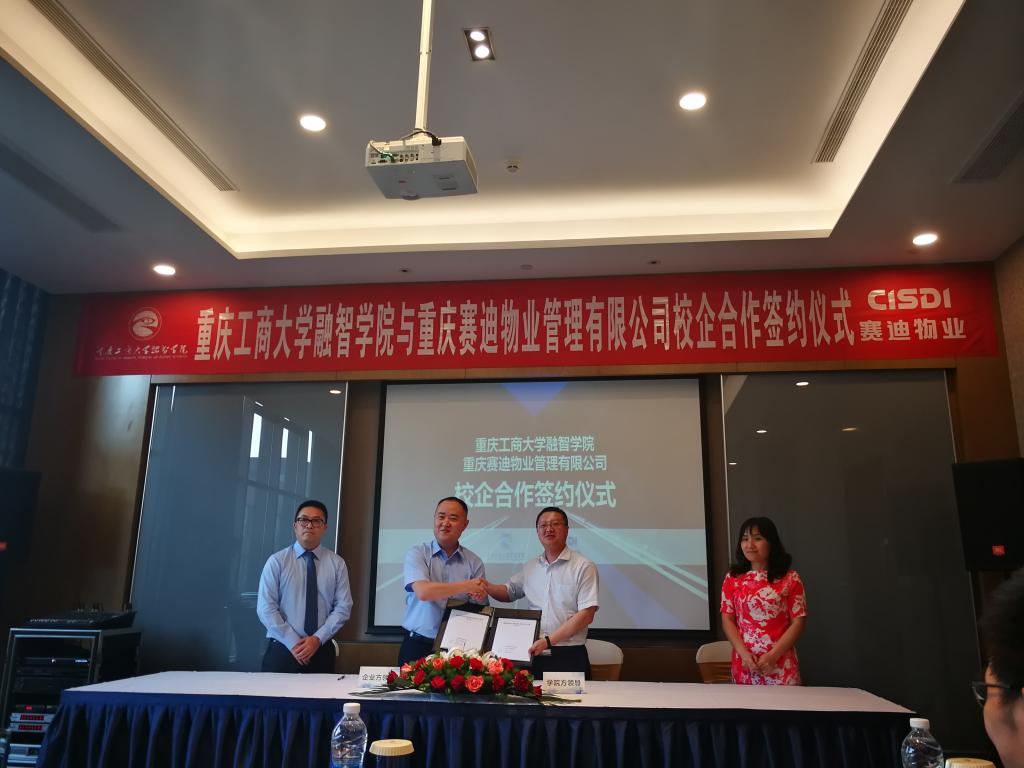 2019年4月25日,重庆工商大学融智学院与重庆赛迪物业管理有限公司签署校企合作协议暨授牌仪式在重庆翰文大酒店成功举行。出席本次仪式的有重庆工商大学融智学院常务副校长吴华安,重庆工商大学融智学院管理工程学院学术带头人刘伟、副院长黄兰、副书记高雪莲等;重庆赛迪物业管理有限公司董事长崔栗,副总经理魏向东、总经理助理左乐等。融智学院部分学生代表和赛迪物业部分员工到场见证了这一时刻。