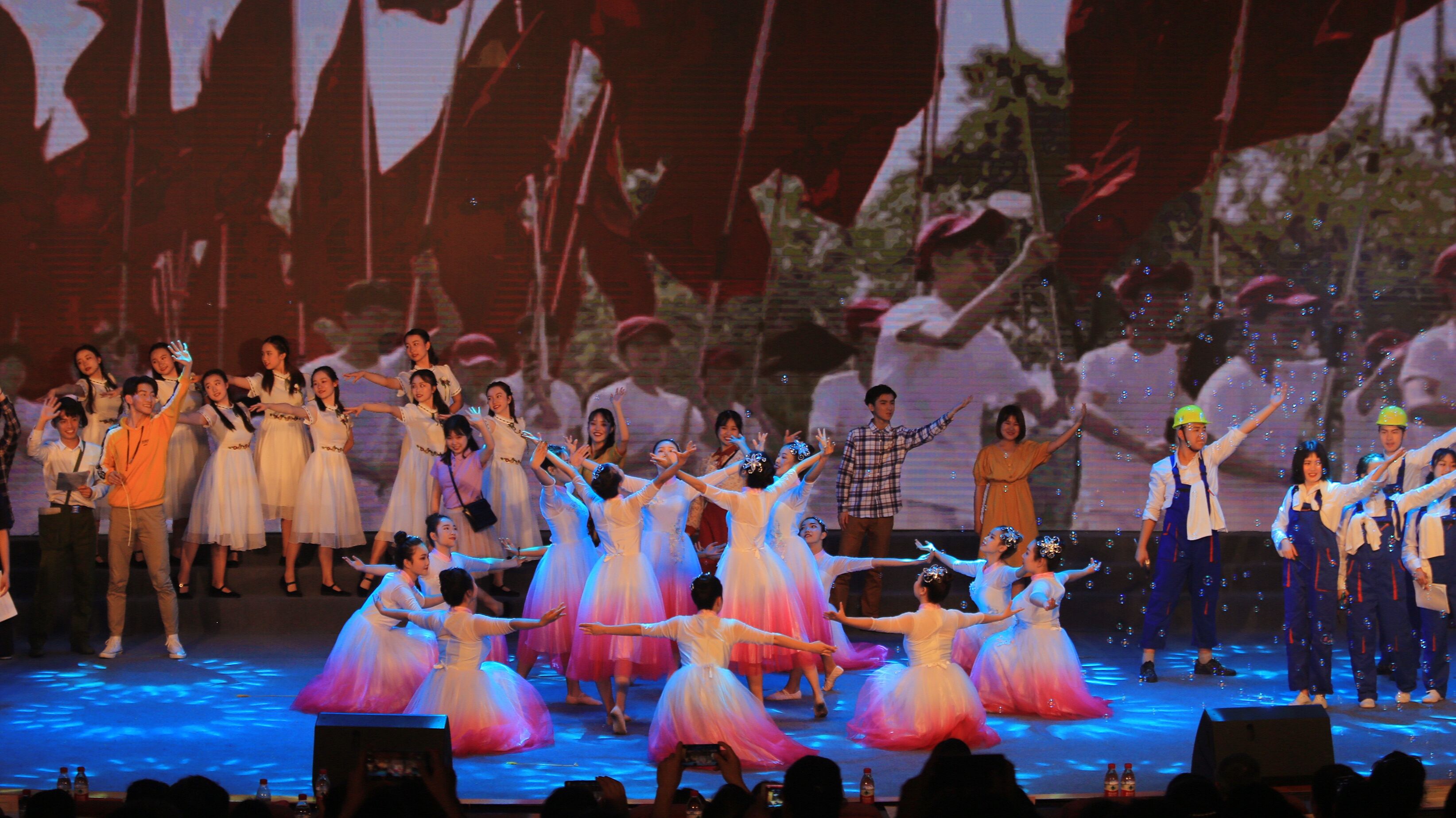 我校主要承担第二篇章的演出内容,第二篇章以“追梦——建设新中国“为题,用情景歌舞的方式展示了1949年中华人民共和国成立后,工人、农民、解放军等各行各业青年热火朝天为建设新中国而奋斗的场景。在我校师生的共同努力下,经过剧本研讨、排练修改、后期彩排等多个环节的反复磨合,每天排练3个场次,历时近30天,最终呈现于舞台。