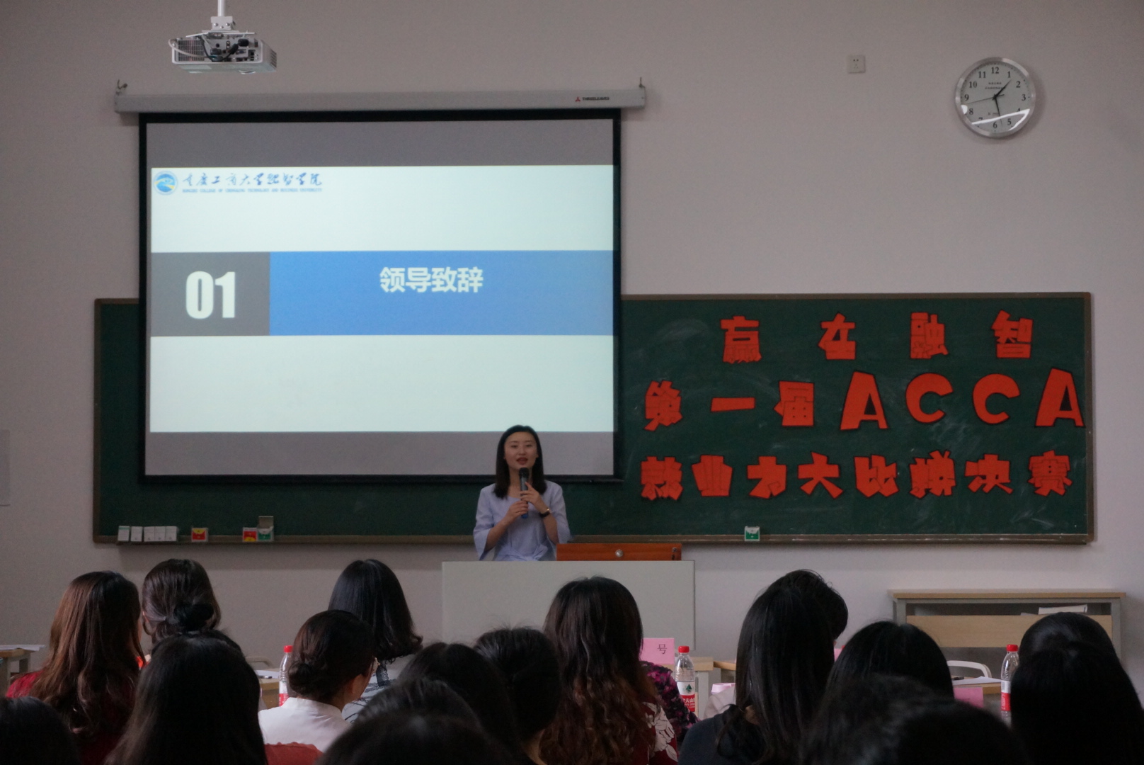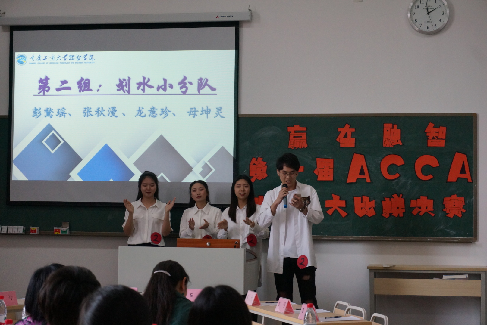 为加强我校ACCA成建制班学生专业技能的培养,全面提升同学们的综合素质和职场竞争力,进一步意识到理论知识与实践相结合的重要性。2019年5月17日下午13:00,由我校举办的“赢在融智”第一届ACCA就业力大比拼比赛决赛在教学楼1207教室成功举行。信永中和审计合伙人陈萌女士、南京永道工程咨询有限公司重庆分公司办公室主任熊模霞女士、中海物业人力资源部经理王晶女士、凯博财经教育优秀教师李薇雨、指导老师杨瑞丽、刘贤洲、陈石、李茉菡以及会计学院18ACCA班辅导员唐凤芬老师出席了本次大赛。