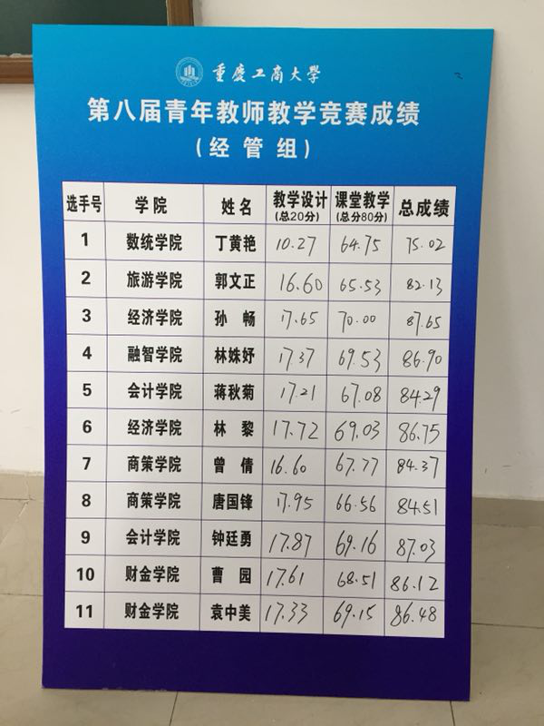 热烈祝贺重庆工商大学第八届青年教师教学竞赛取得圆满成功。同时也希望通过这次比赛,各位老师以赛促教、提升水平,在比赛中不断进步,实现价值。