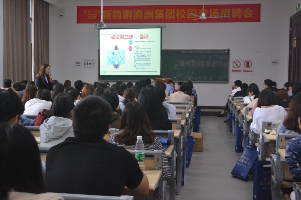 在招聘会伊始,主讲人孙总用一段简短的企业宣传视频从发展历程、发展战略、公司架构等几个方面对新鸥鹏渝州集团作了详细介绍,并表示渝州集团为大家提供的不仅是一份工作,更是一个实现梦想的平台。随后,我校2013级学姐罗乙会向同学们分享了自己在渝州集团的职业规划和工作经历,让同学们对企业财务会计有了进一步的了解在提问环节,现场氛围热烈,同学们结合自身情况积极提问,孙总也结合公司的状况和多年来的工作经历和感悟,与同学们进行了深入的交流和讨论,畅谈寻求发展之路,并对同学们的提问进行一一回答。孙总指出,公司在选人时更注重求职者的思考能力和综合素质,希望同学们在求职时能够正确认识自己,充分展现自身的优势赢得面试官的肯定。
