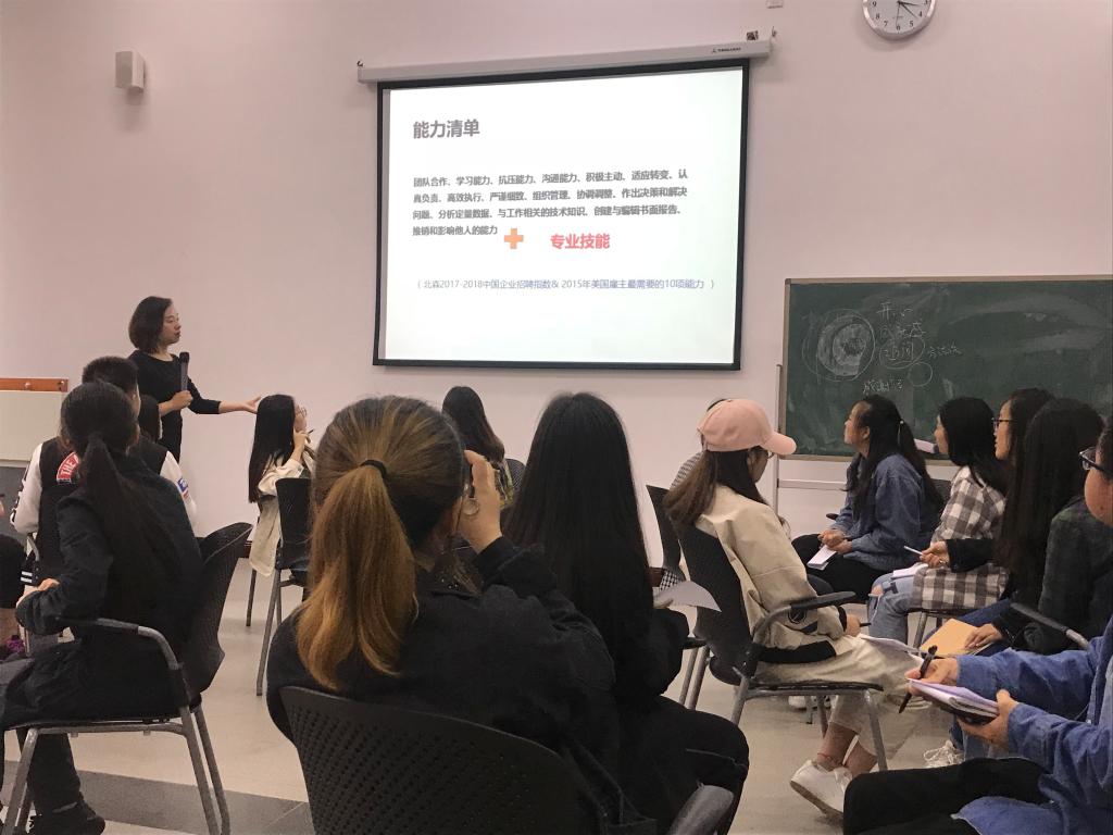 在第三环节,田老师带领大家根据《2017-2018中国企业招聘指数》中雇主最需要的“能力清单”整理自己的能力,挖掘自己的能力,强调要将自己的长板无限延长,具备优势思维,看到自己的闪光点,优势即职业生涯规划的奠基石。最后一个环节中,每组代表从个人、团体、生涯三个层面进行团体回顾与个人回顾,发言代表纷纷表示在本次活动中收获颇多。
