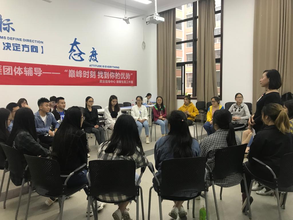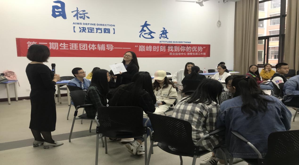 为引导学生找到自己的能力优势,认清职业发展的目标,把握当下努力的方向,2019年5月30日,由就业指导中心、德馨生涯工作室协同举办的“巅峰时刻 找到你的优势”第二期生涯团体辅导在1208教室顺利开展。本次团辅由西南大学澳门新葡京博彩处就业中心主任、GCDF全球职业规划师、BCC生涯教练的田振敏老师主讲。德馨生涯工作室全体成员参与了观摩学习。