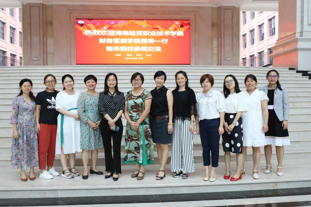 2019年6月12日上午9:30,海南经贸职业技术学院财务管理学院副院长何宇宏一行到我校进行参观交流。我校党群工作部倪倩茜部长、财富管理学院赵娜副院长、教务处产教融合科王艺燃科长、财务管理教研室唐莉副主任、投资教研室赵明慧副主任以及财务管理教研室、投资教研室骨干教师在1220智慧教室接待了来访嘉宾。