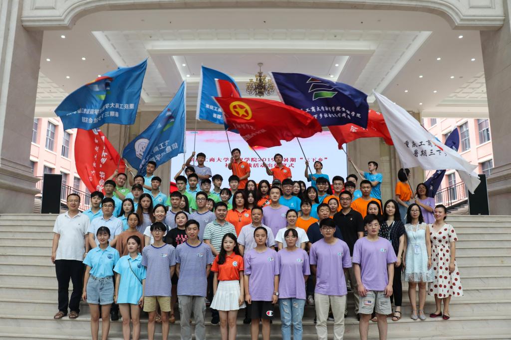 2019年7月3日中午12:10,重庆工商大学融智学院2019年“三下乡”暑期社会实践出征仪式在教学楼大厅顺利举行。重庆工商大学融智学院党委副书记陈龙国、学生处副处长兼团委书记李刚、会计学院团总支书记李兰、金融学院团总支书记于成江、物流工程学院团总支书记刘有沛、商务学院团总支书记徐繁生、信息工程学院团总支书记梁建良以及管理工程学院团总支书记范雪林出席仪式。“三下乡”社会实践团队带队教师、队员代表近300人参加了出征仪式。