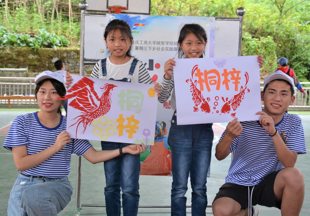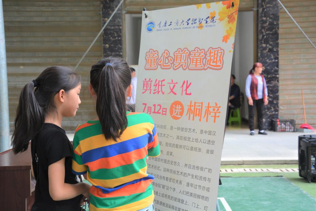 桐梓镇位于武隆区东北部,属于偏远的高山乡镇,经济较为落后,当地村民外出务工之后,子女多和爷爷奶奶住在一起。“三下乡”团队不畏酷暑来到桐梓镇,用中国传统剪纸活动丰富留守儿童的暑假生活。