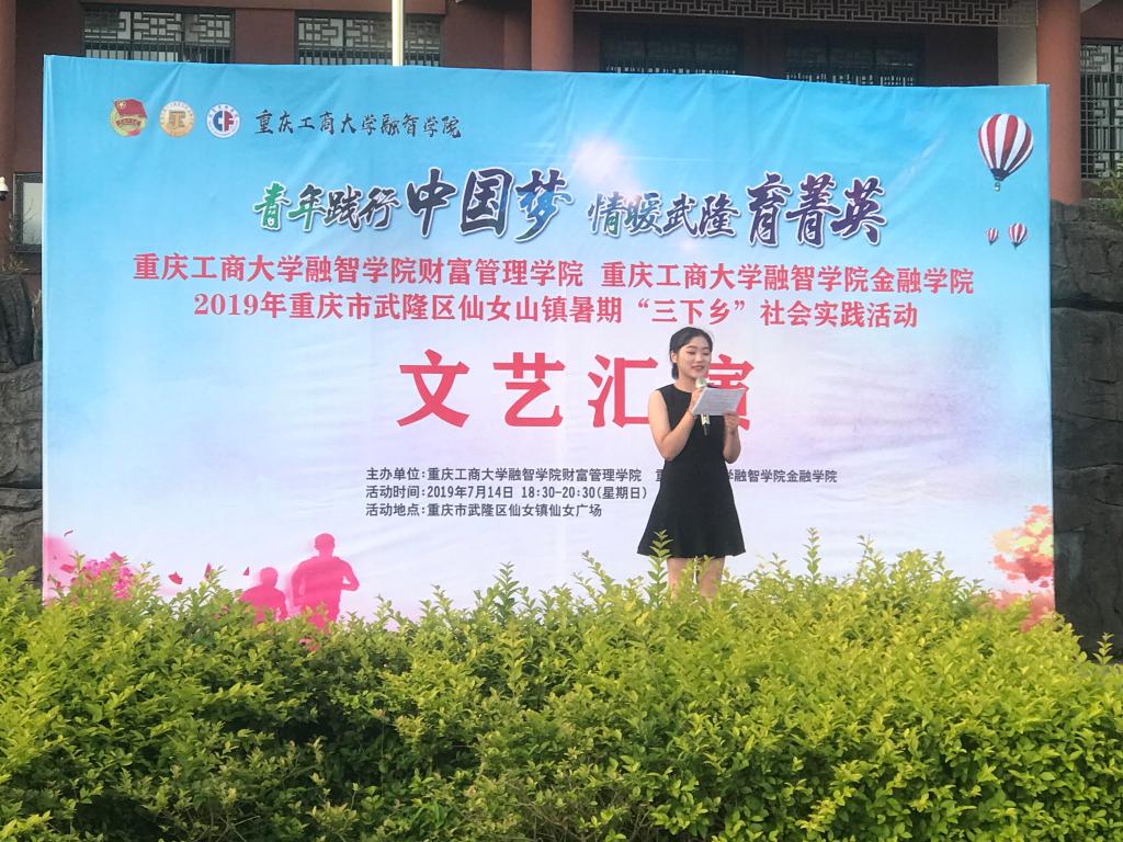7月14日晚,重庆工商大学融智学院金融学院联合财富管理学院暑期“三下乡”社会实践志愿服务团来到武隆区石梁子社区仙女广场为当地群众带来了一场精彩纷呈的文艺表演,现场人头攒动,气氛火热。