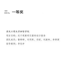 “挑战杯”全国大学生课外学术科技作品竞赛是大学生课外学术科技活动中一项具有导向性、示范性和群众性的竞赛活动。我院代表队以目前医学界腔内检查技术亟待完善为切入点,在专业教师李先冲老师的指导下从安全舒适性、操作便利性等角度设计了探查抽吸仪。以“关于观察吸引器的设计报告”为题的生命科学类作品参加科技创新类决赛,并获得重庆市一等奖。