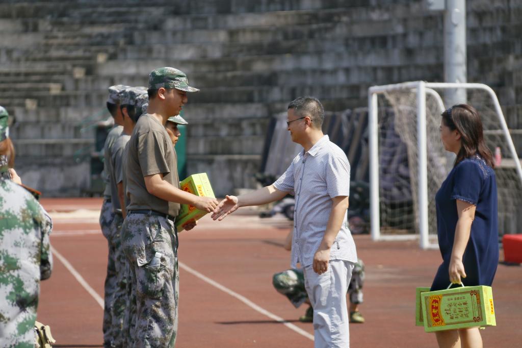 吴校长对教官们在训练过程中的辛苦付出表示感谢,并将凉茶、月饼等慰问品送到他们手中。同时他希望,在接下来的训练时间中,教官们能够继续将学生的体能训练和思想意念结合在一起,循序渐进,认真地为2019级新生上好大学第一课。