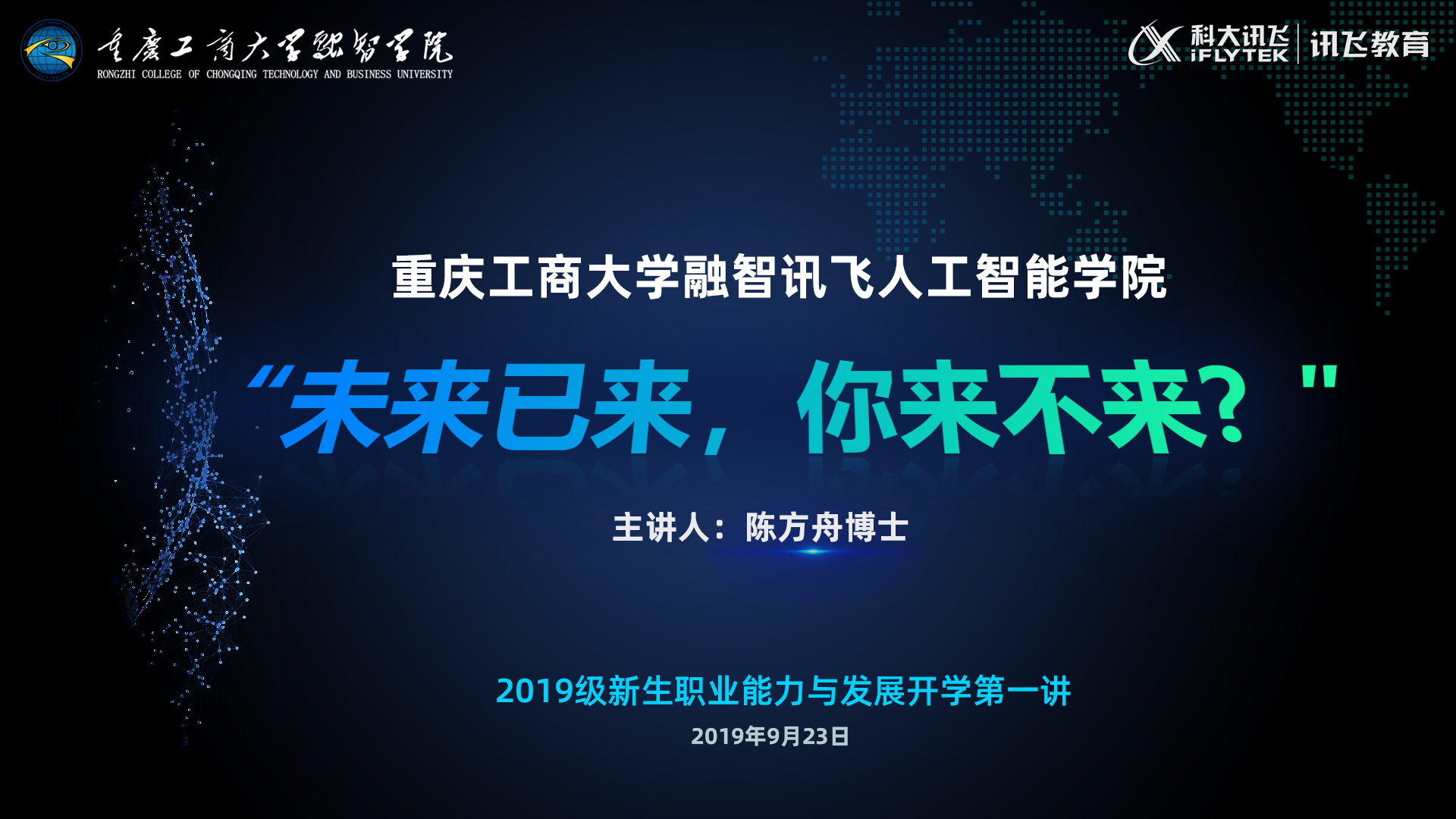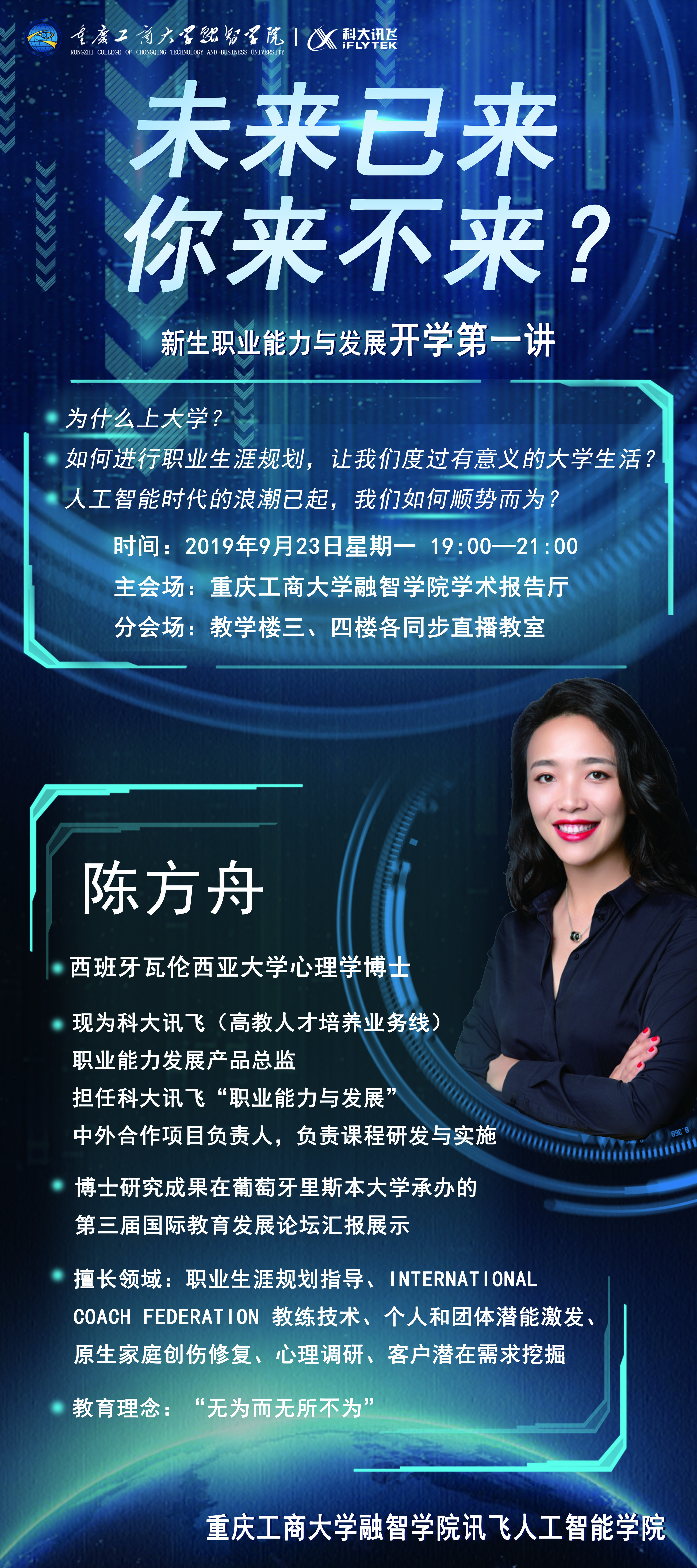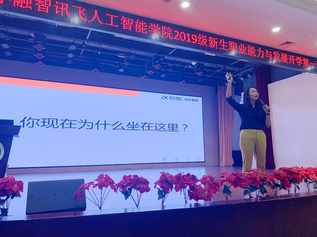 围绕上述问题,为了有效帮助学生更好的做好职业生涯规划,2019年9月23日晚19:00-21:00,科大讯飞股份有限公司(高教人才培养业务线)教育质量总监陈方舟博士以“未来已来,你来不来?”为主题作为2019级讯飞人工智能学院新生职业能力提升与发展开学第一讲在融智学院的学术报告厅拉开帷幕。
