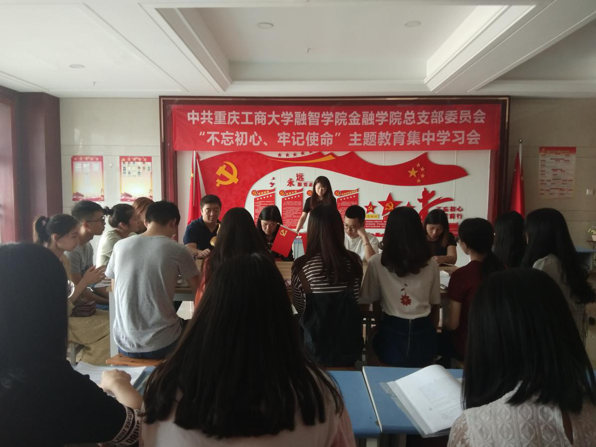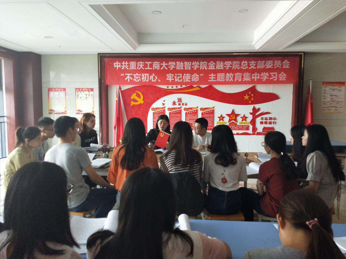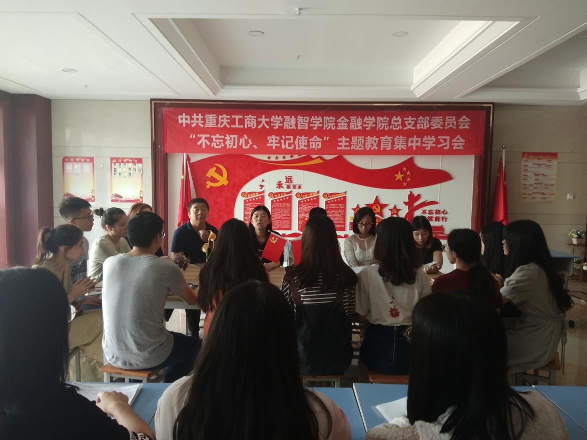 9月29日下午,为深入学习贯彻“不忘初心、牢记使命”主题教育,进一步落实党支部“三会一课”学习制度,重庆工商大学融智学院金融学院学生党支部在G4党员活动室召开了本学期第一次支部大会。参加此次会议的有金融学院党总支陈萍副书记、学团办主任于成江老师、学生党支部书记刘官青老师、学生党支部组织委员兼纪检委员郑志欣老师、专职辅导员杨梅老师。