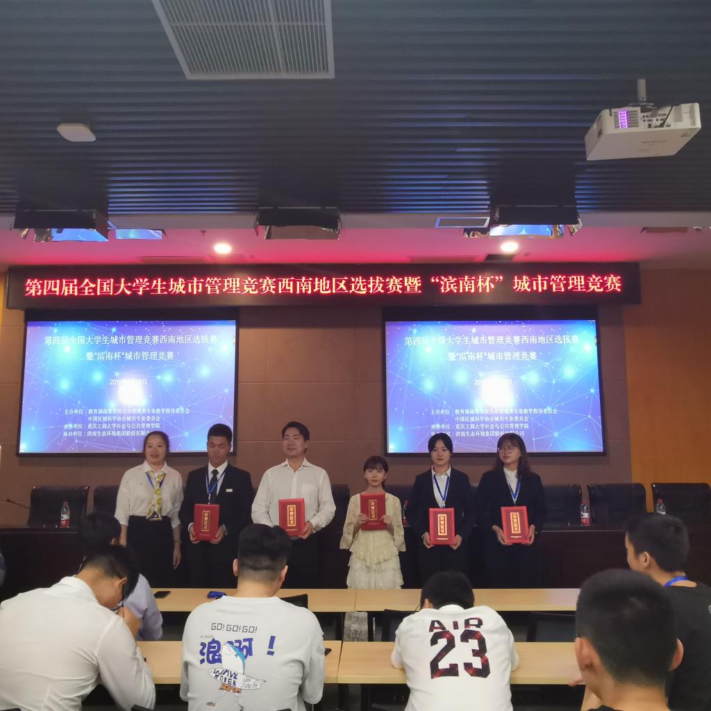 2019年09月28日,由教育部公共管理学科教学指导委员会和中国区域科学协会城市管理学会主办,重庆工商大学社会与公共管理学院承办,重庆滨南生态股份有限公司协办第四届全国城市管理竞赛西南片区选拔赛在重庆重庆工商大学南岸校区顺利举行,来自西南地区80多个参赛小组参加了决赛。我校9个小组,共计40余名学生在信息工程学院姜文副院长,李辉院长助理和孙英老师、刘小飞老师、屈芳青老师以及孙敖老师的指导和带领下参加了此次比赛,由于赛前准备充分,赛场发挥良好,本次比赛中我校取得了优异成绩,共斩获一等奖1个、二等奖3个和三等奖5个以及优秀组织奖。除此之外,我校将有4个组参加11月1日在南开大学举行的第四届全国大学生城市管理竞赛决赛。
