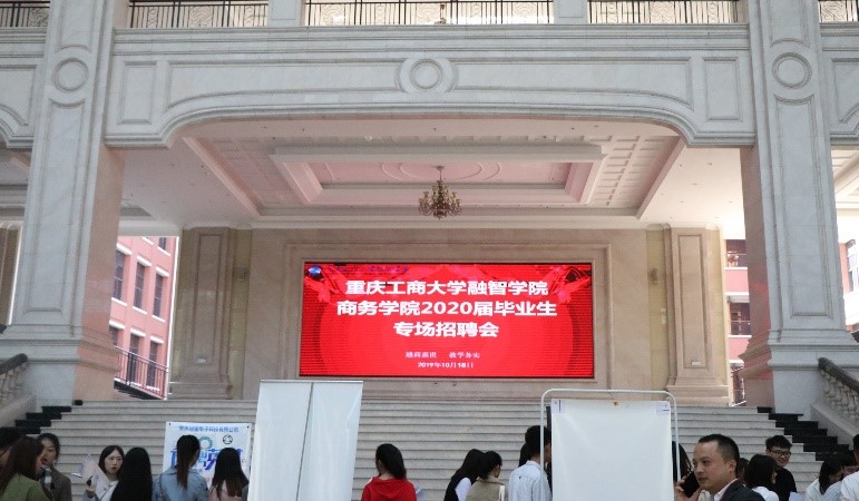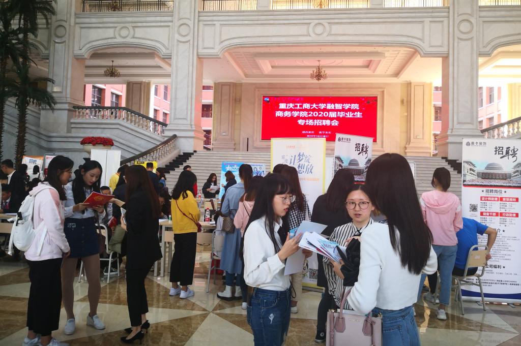 (通讯员:胡思琪、蒋如熙、熊浚利)为更好地拓宽毕业生就业渠道,增强毕业生与用人单位沟通,我校商务学院和重庆聚焦人才服务有限公司于10月18日下午2点在教学楼大厅联合举办了“汇博网2019秋季名企巡回双选会——重庆工商大学融智学院商务学院”专场招聘会。根据企业资质及专业匹配度,商务学院从100余家报名单位中筛选了近50家单位参加此次招聘会。用人单位的人才需求不仅覆盖了商务学院网络与新媒体、会展经济与管理、国际经济与贸易及国际商务等专业,也涉及我校其他经管类专业,提供了近500个就业岗位。