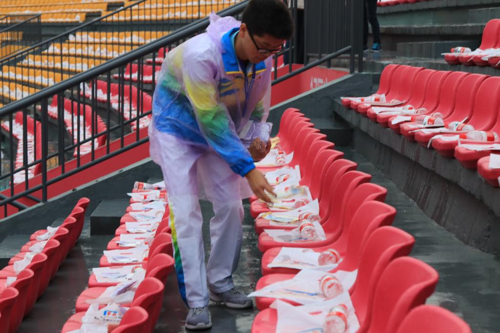 根据大会安排,我校100名志愿者被分为现场控制组、后勤保障组、宣传组、机动组、入场方阵组、文体展演组以及观众组织组等七个组。18日下午和19日,100名志愿者将运动会所需要用到的2万多名观众的充气棒、国旗,流程单等物资全部装袋完成,并将所有物资摆放到位。