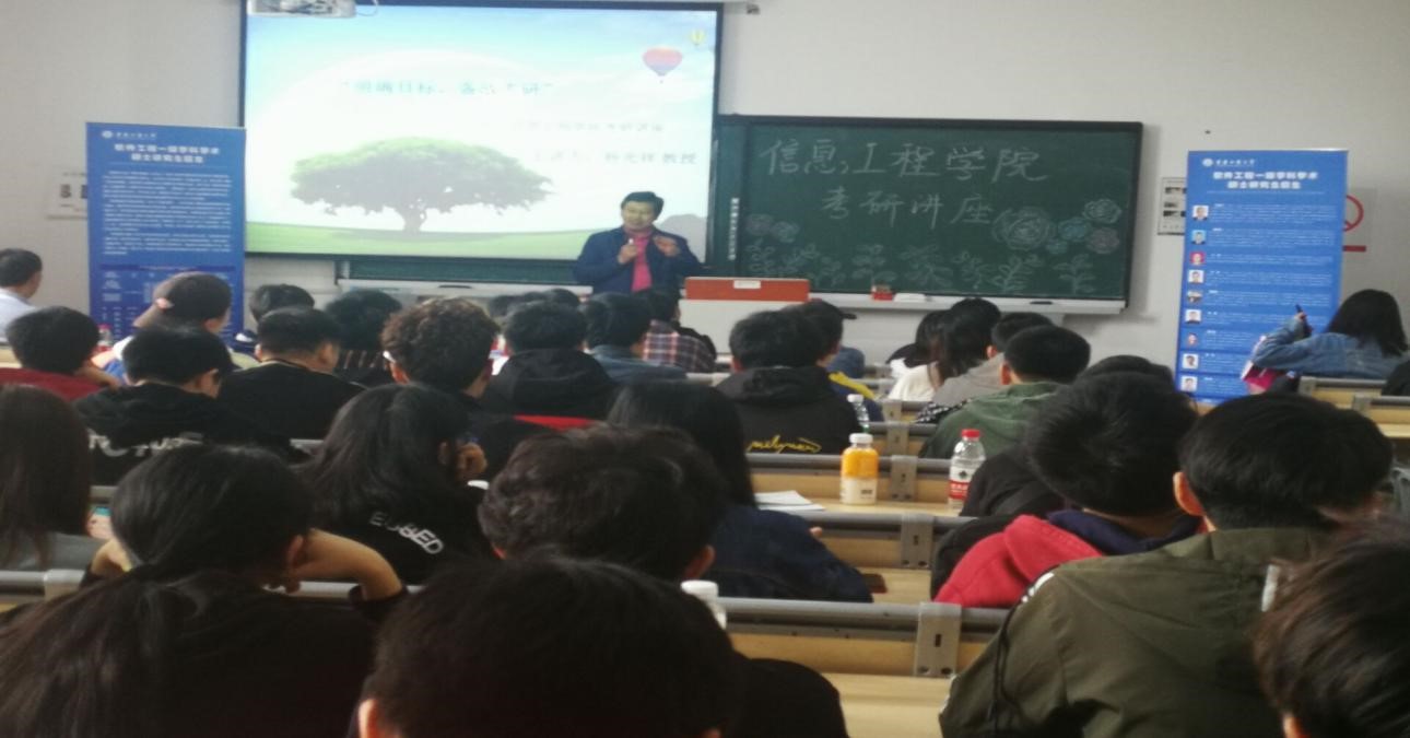 2019年10月17日中午13点,我院在1307教室举行了“明确目标,备战考研”主题考研讲座。本次讲座邀请到重庆工商大学计算机科学与信息工程学院杨光祥教授来为同学们提供专业考研指导。参加此次讲座的有信息工程学院党总支副书记叶远帆老师,信息工程学院副院长姜文老师,教研室主任王莉莉、左智科老师、专职辅导员何建旭老师、汪建军老师以及2017级各班有意向考研的同学们。