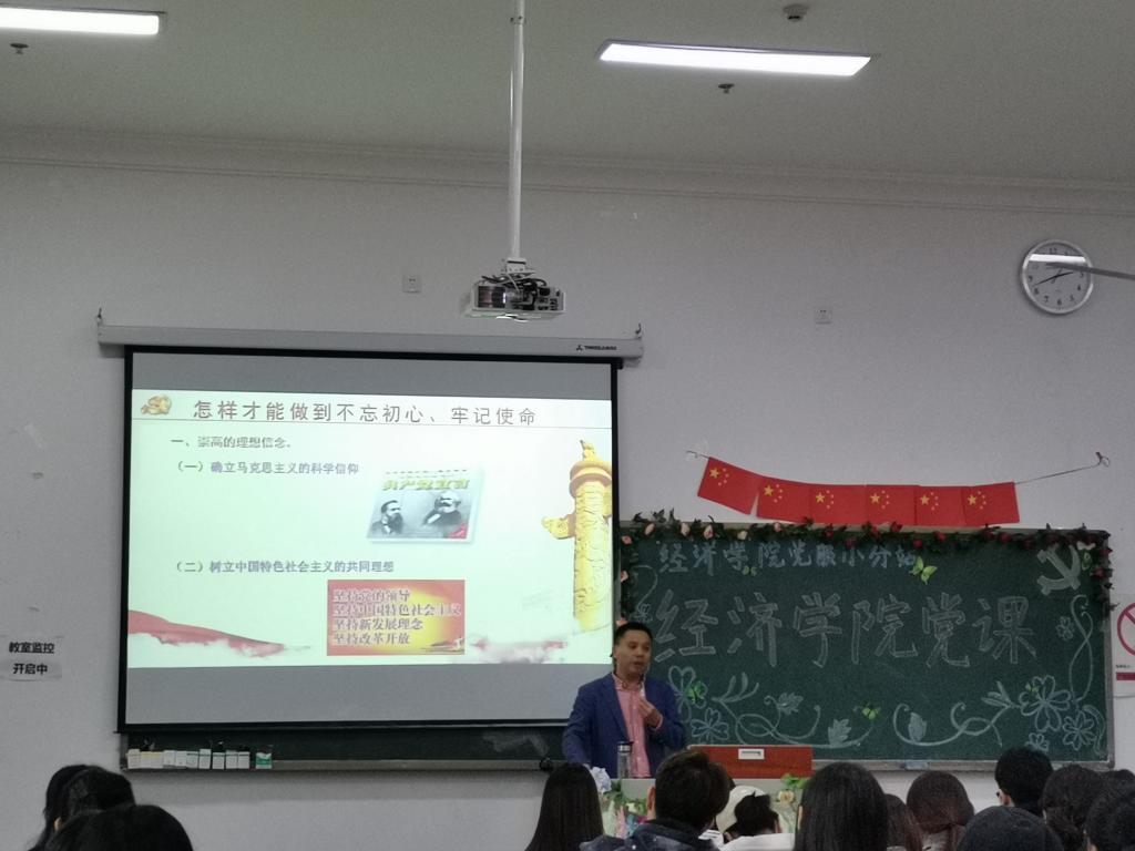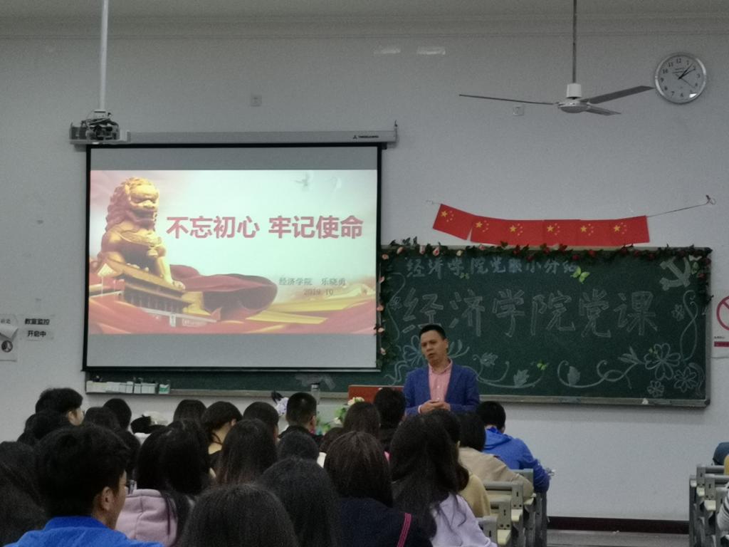 2019年10月22日中午12点20分经济学院学生党支部“不忘初心、牢记使命”主题教育党课在1406教室顺利开展,本次党课由经济学院党总支副书记乐晓勇老师主讲。经济学院全体学生党员、发展对象、入党积极分子参加本次党课培训。