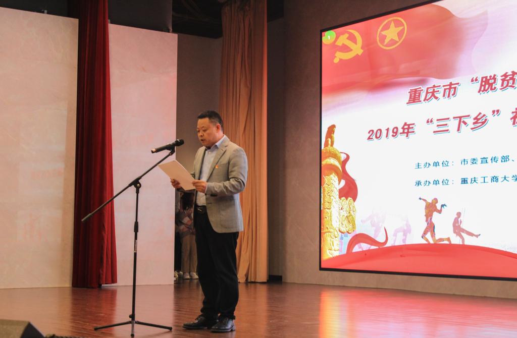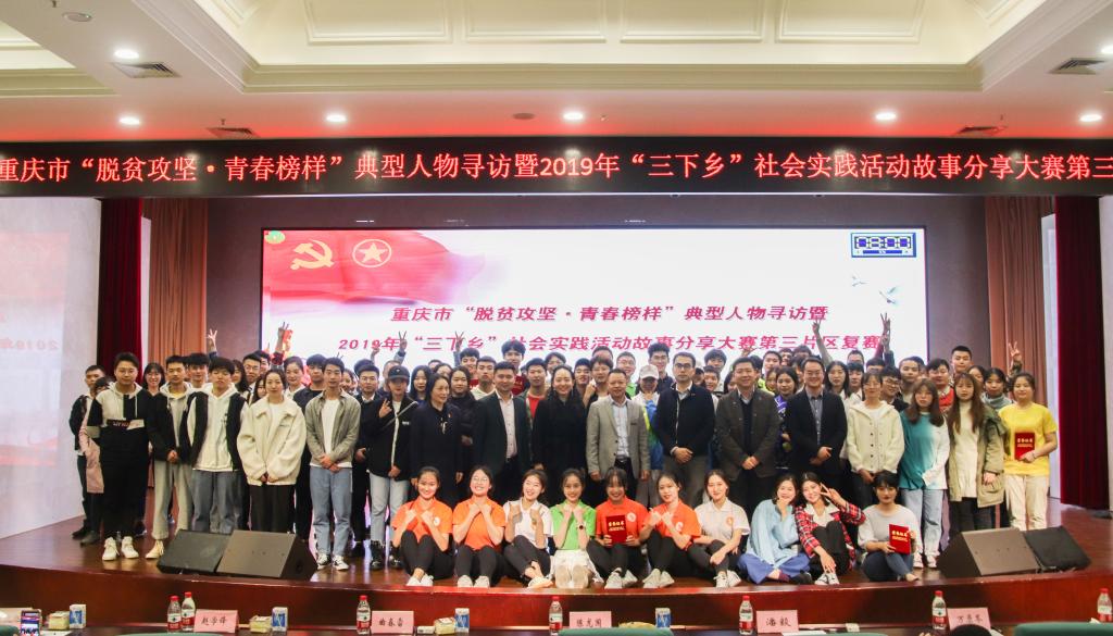 为深入贯彻落实《中共重庆市委重庆市人民政府关于打赢打好脱贫攻坚战三年行动的实施意见》精神,充分展示广大团员青年在脱贫攻坚一线的生动实践,充分挖掘扶贫一线励志感人的青春故事,进一步动员、凝聚社会力量参与扶贫。10月25日上午,由市委宣传部、市文明办、市委教育工委、市教委、团市委、市社科联、市学联等单位联合举办的重庆市“脱贫攻坚•青春榜样”典型人物寻访暨2019年“三下乡”社会实践活动故事分享大赛第三片区复赛在我校举办。出席本次比赛的嘉宾有:团市委高校工作部部长潘毅、重庆工商大学融智学院党委副书记陈龙国、团委书记李刚。担任本次比赛的评委有团市委中学与少先队工作部副部长万原岑同志、重庆市演讲协会秘书长赵学锋、重庆市曲艺家协会副主席曲春雷、巴南团区委书记腊丁扬以及巴南区文化馆馆长郑迎旭。来自重庆工商大学、西南政法大学等10余所高校的20支参赛团队和指导老师共计300余人参加活动。