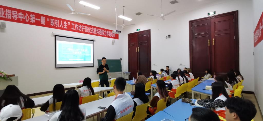为发展学生职业能力,提升就业力,澳门新葡京博彩处就业指导中心特围绕当下企业最看重的职业通用能力,开展含沟通能力、职场礼仪、团队合作能力、新媒体运营能力、压力调适能力、商务写作能力等专题培训的“职引人生”工作坊。2019年10月24日14:30在教学楼1118教室举行了就业指导中心第一期“职引人生”工作坊开班仪式暨沟通能力专题培训。开班仪式由招就处副处长罗婷婷主持,特邀我校校友、ACIC国际品牌策划师、重庆赞成文化传播有限公司总经理刘晨光为此次专题培训讲师。