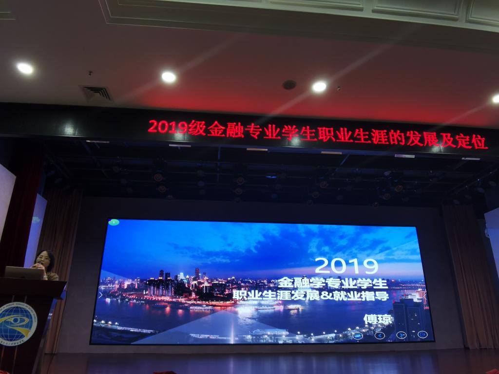 为引导2019级金融大类全体新生更好地适应大学生活,了解金融行业定位,尽早确立大学生涯规划和职业生涯规划。2019年10月31日晚,重庆工商大学融智学院金融学院邀请资深金融界人士联讯证券重庆分公司总经理助理傅琼女士在学术报告厅开展了《金融专业学生职业生涯发展及定位》专题讲座。场内座无虚席,金融学院副院长贺晗、党总支副书记陈萍2019级全体辅导员和2019级金融学类全体学生听取了此次讲座。