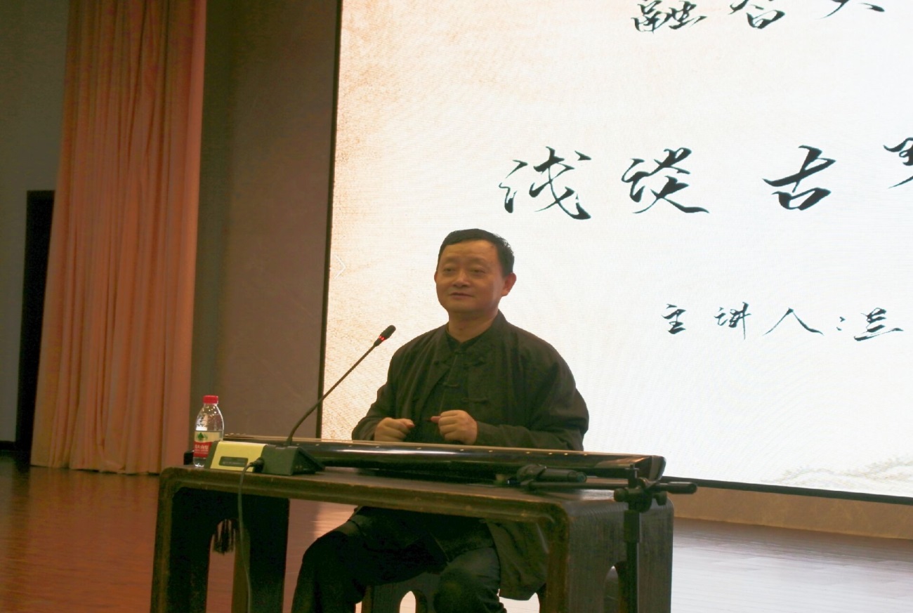 讲座伊始,兰先生向同学们分享了自己这些年在古琴传承方面的努力。他坚持海纳百川,兼收并蓄,融汇贯通,广泛吸取各流派优秀理论和技法,形成苍劲高古、跌宕悠远的鲜明艺术风格。坚持以传统经典和口传心授的方式,确保书画和古琴艺术的经典传承,培养了一大批优秀琴人和书画人才。对于古琴的传承,兰先生无私奉献,积极投身公益,在重庆市委宣传部、重庆市委党校、重庆工商大学、重庆市区图书馆等30多所大中小学、20多个街道社区、20多个企事业单位举办公益古琴演出、讲座等活动。