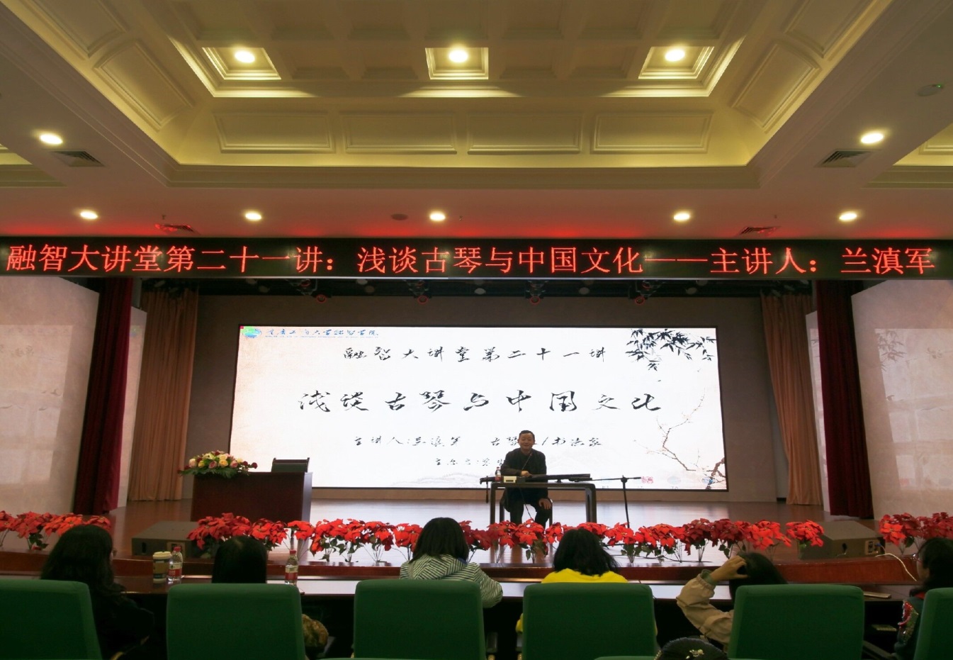 文化是民族的血脉,是人民的精神家园。文化自信是更基本、更深层、更持久的力量。为了不断增强中华优秀传统文化的生命力和影响力,丰富拓展校园文化,我校于2019年11月13日下午2:30在学术报告厅开展了融智大讲堂第二十一讲“古琴与中国文化”主题讲座。本次讲座由商务学院承办,特邀著名书画家、古琴家兰滇军先生作为主讲人。兰滇军先生现为中国书法家协会会员,重庆市书画研究会副会长,重庆书画院教学部主任,重庆市非物质文化遗产古琴传承人,重庆市音乐家协会古琴专业委员会会长。