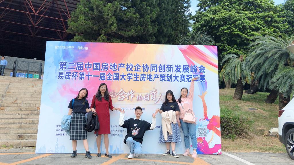 为提升大学生创新思维,增强实践能力,由中国房地产业协会指导、中国建设教育协会主办、北京建筑大学经济与管理工程学院、深圳大学土木与交通工程学院和房教中国承办、易居中国企业集团冠名的“易居杯”第十一届全国大学生房地产策划大赛于2019.11.23—11.24日在深圳大学举行。经过校内赛、区域赛的层层筛选,由房地产开发与管理专业2016级学生组长郑博文,组员魏泽玲、冯秀琴、罗蜀南、张媛五名同学组成的0090格格屋团队,在指导教师杨小梅教授的精心指导和带领下冲进了全国总决赛。