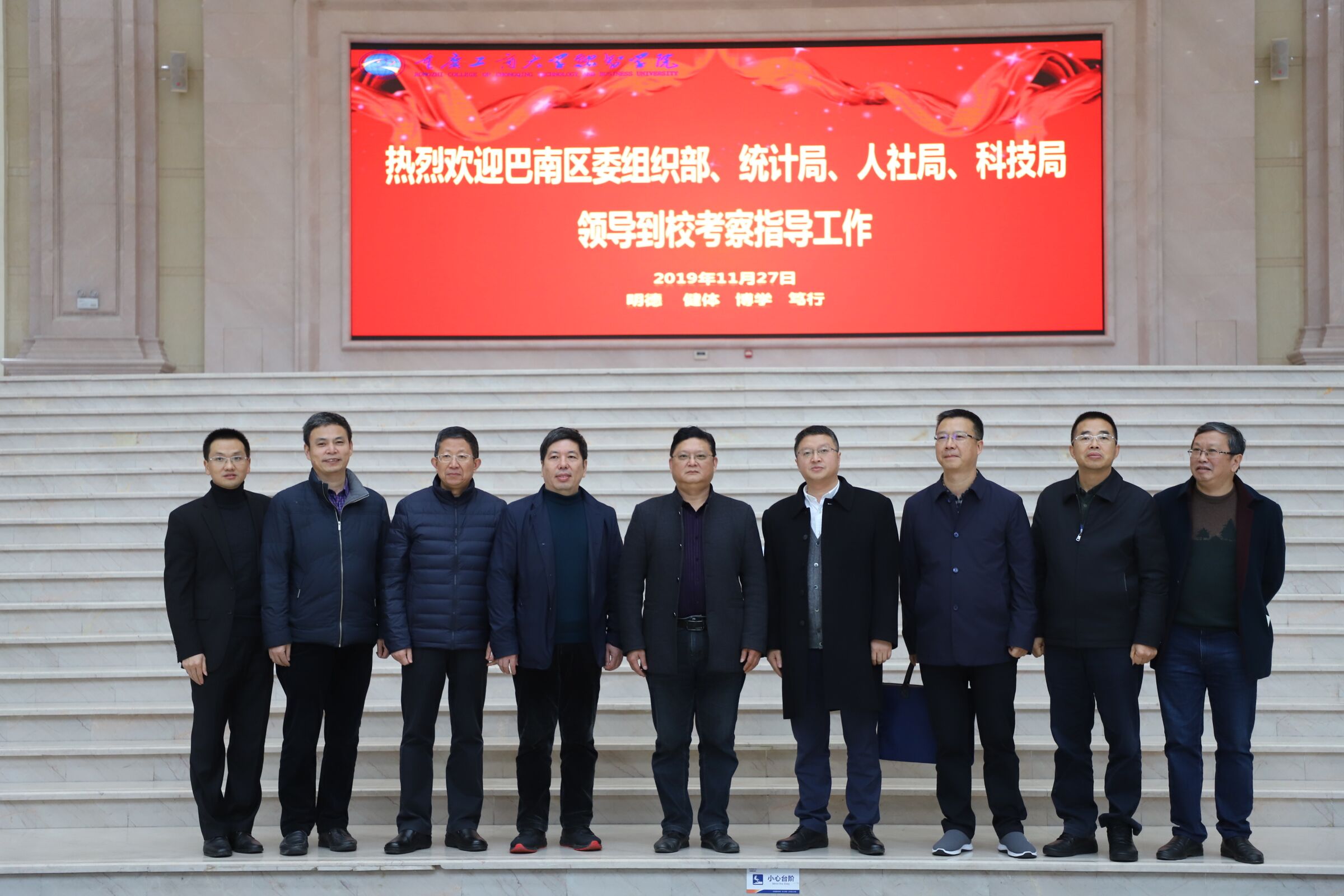 2019年11月27日,重庆市巴南区委组织部副部长郭文厚携同巴南区统计局局长李昀、副局长李静、苟晓彬,人社局副局长胡跃进、科技局副局长陈昌荣以及高职城副总经理施硕一行,莅临学校考察指导工作。