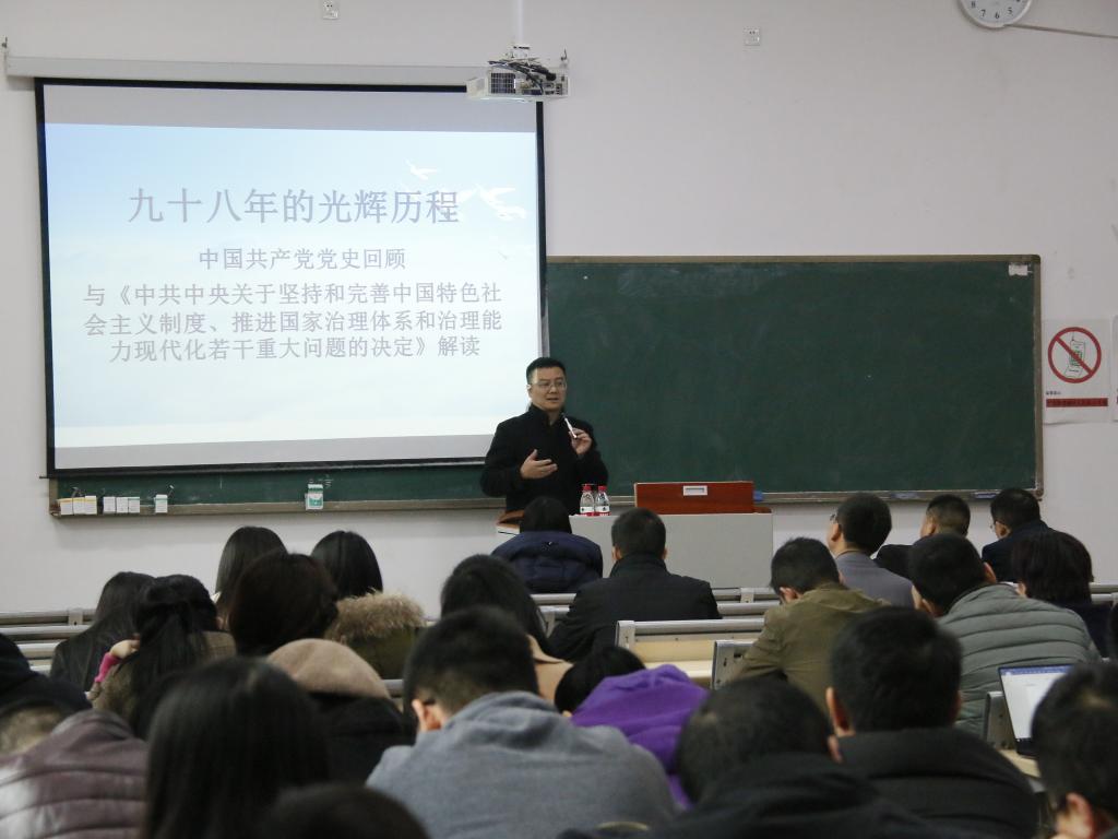 为扎实推进“不忘初心、牢记使命”主题教育,进一步激励和引导广大党员干部更加坚定自觉地践行党的初心和使命,根据学校《“不忘初心、牢记使命”主题教育工作方案》的要求,1122日,我校“不忘初心、牢记使命”主题教育专题党课在1406教室顺利召开。校党委书记丁广龙以“九十八年的光辉历史——中国共产党党史解读”为主题,结合十九届四中全会精神,为全体教师党员讲授了主题教育专题党课。专题党课由党群工作部部长倪倩茜主持。