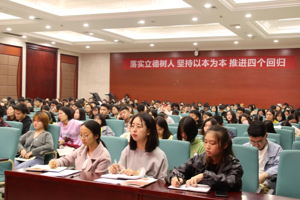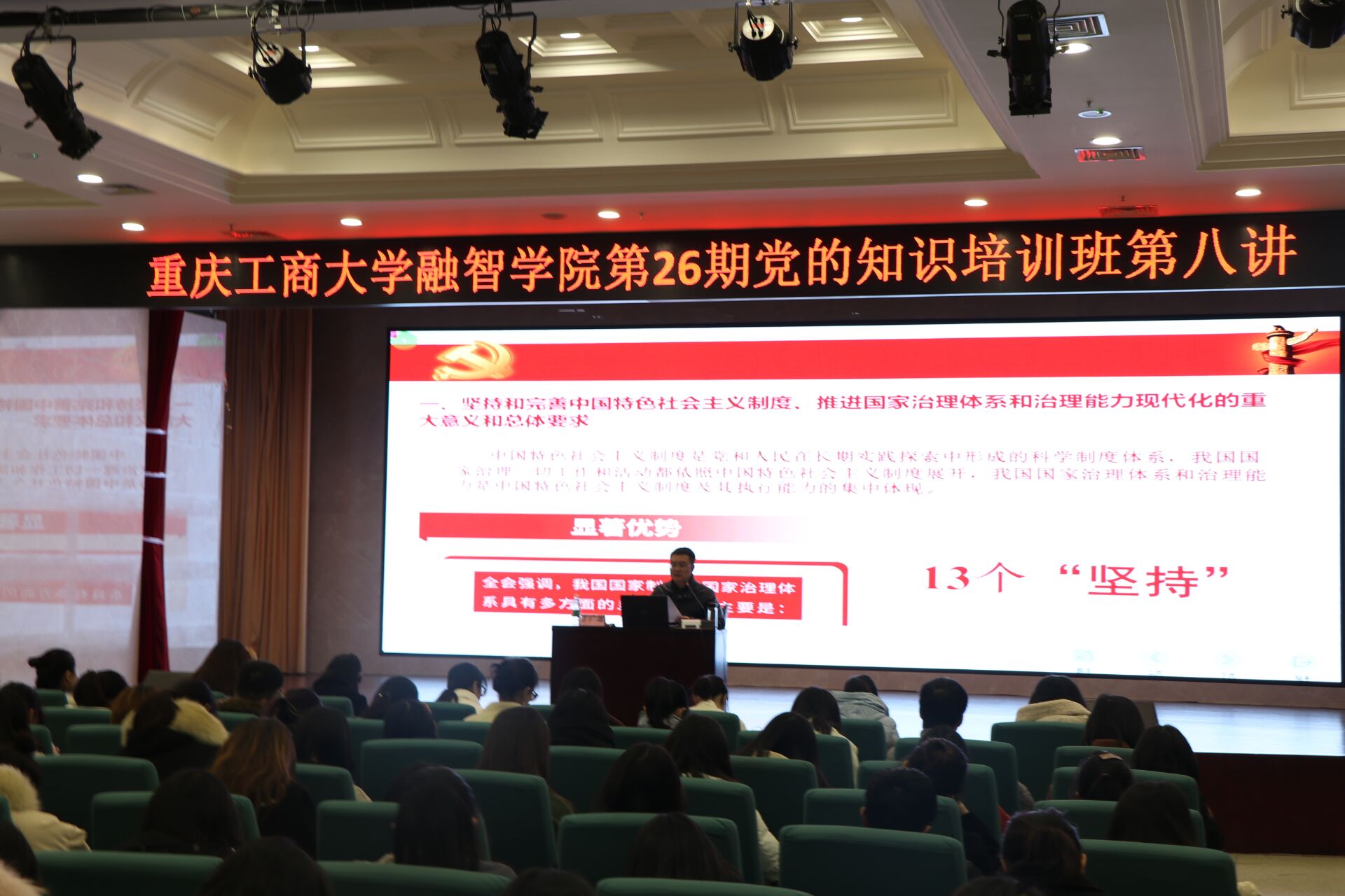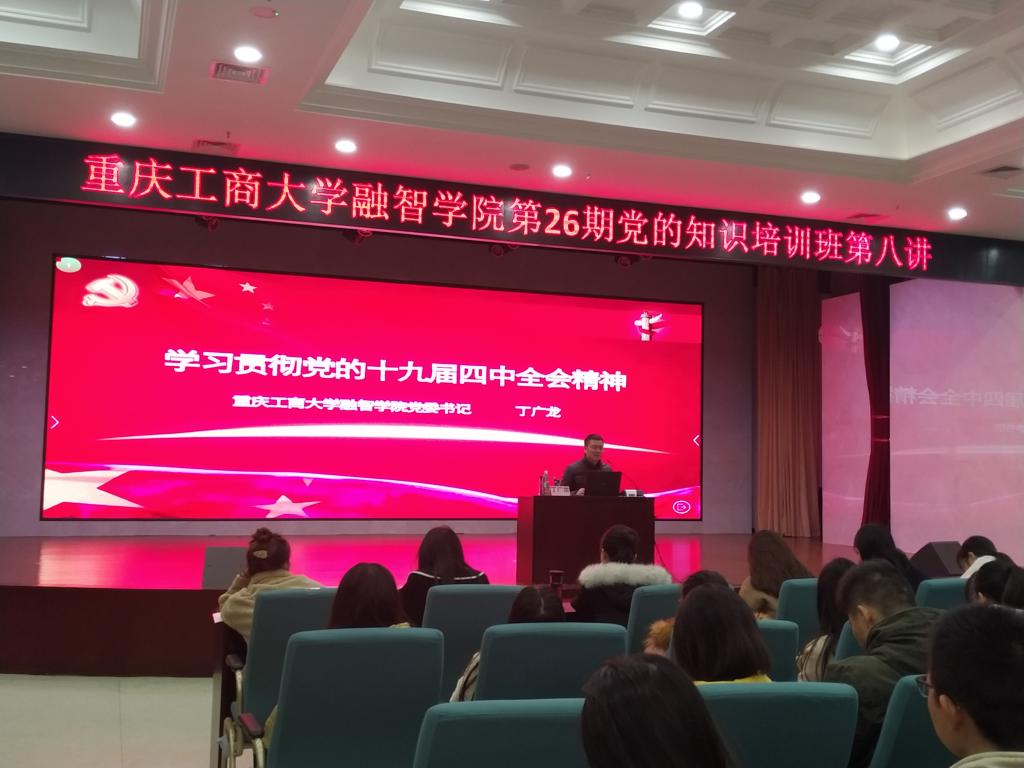 为加深学生对党史的了解,促进理论知识学习,提高思想政治觉悟,培养合格的入党积极分子,11月29日中午12:30,重庆工商大学融智学院第26期党的知识培训第八讲在学术报告厅开讲,350余名学员参加了此次培训。此次党课以“学习贯彻党的十九届四中全会精神”为主题,由重庆工商大学融智学院党委书记丁广龙主讲。