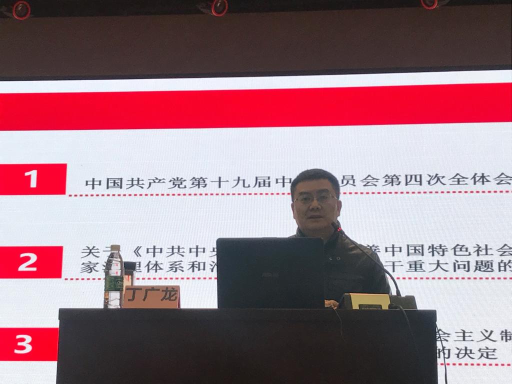 丁书记为全体学员详细介绍十九届四中全会的概况和大会所取得的成就,他为学员们深入讲解了关于《中共中央关于坚持和完善中国特色社会主义制度推进国家治理体系和治理能力现代化若干重大问题的决定》起草的背景和过程。他还强调,党的十九届四中全会对决胜全面建成小康社会、全面建设社会主义现代化国家,对巩固党的执政地位、确保国家长治久安,具有重大而深远的意义。