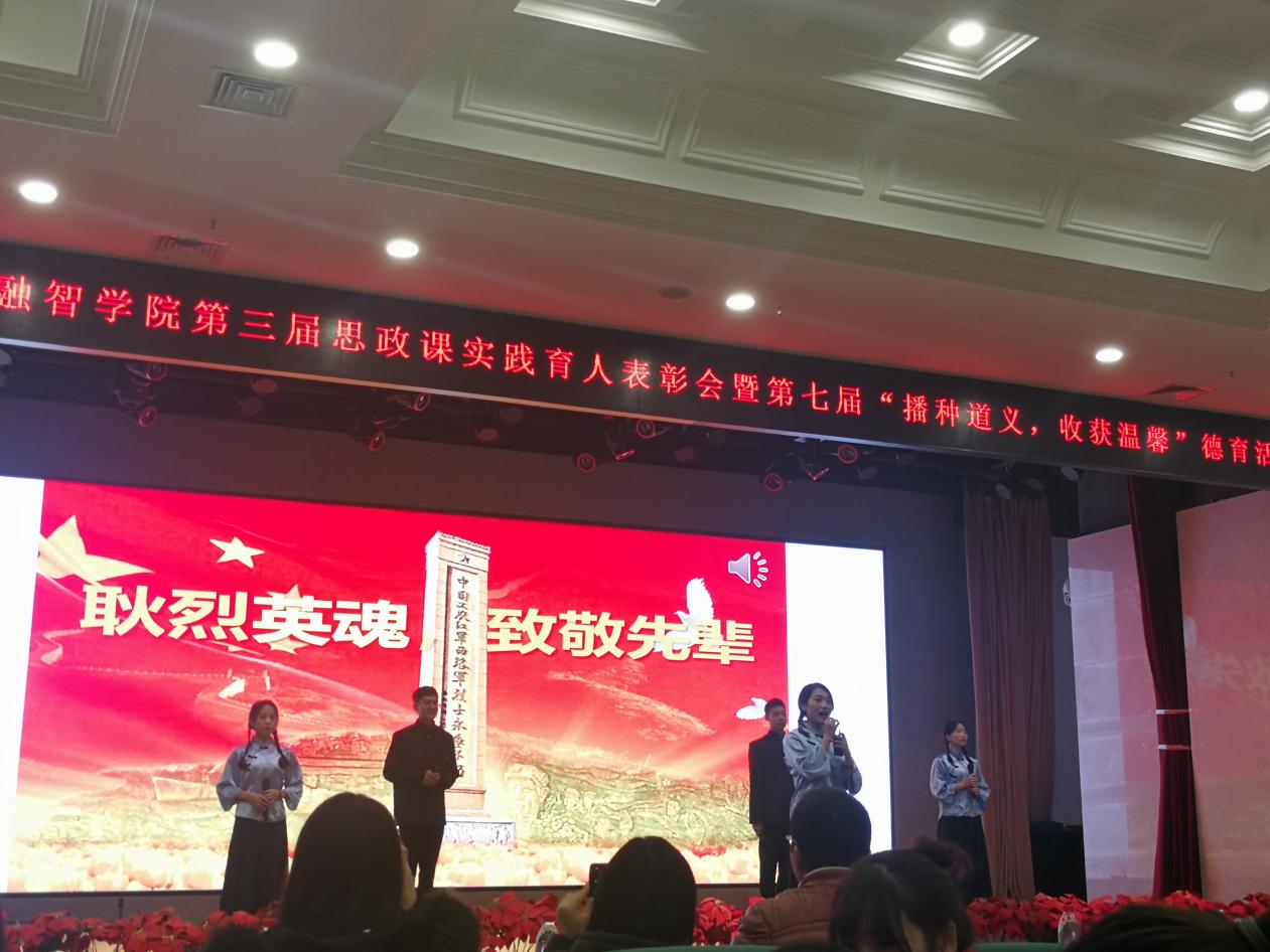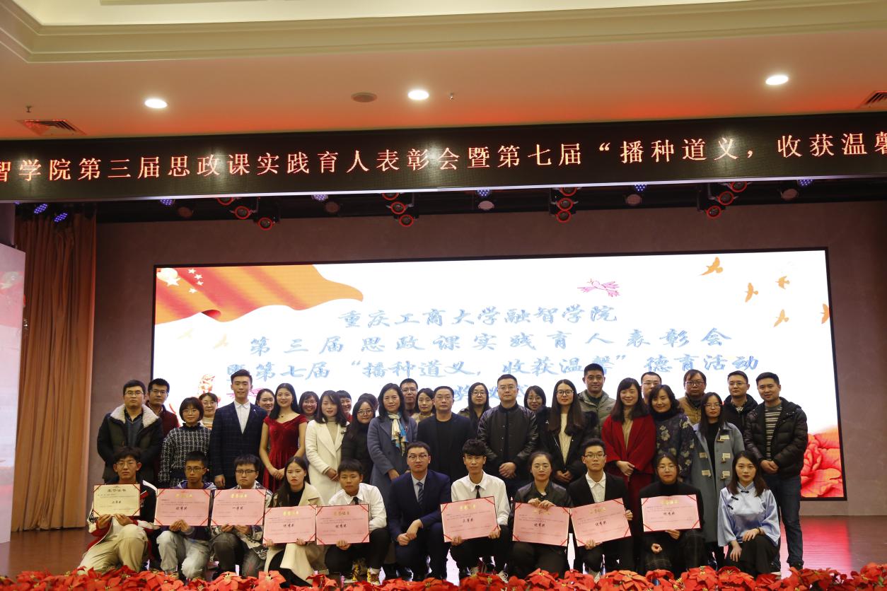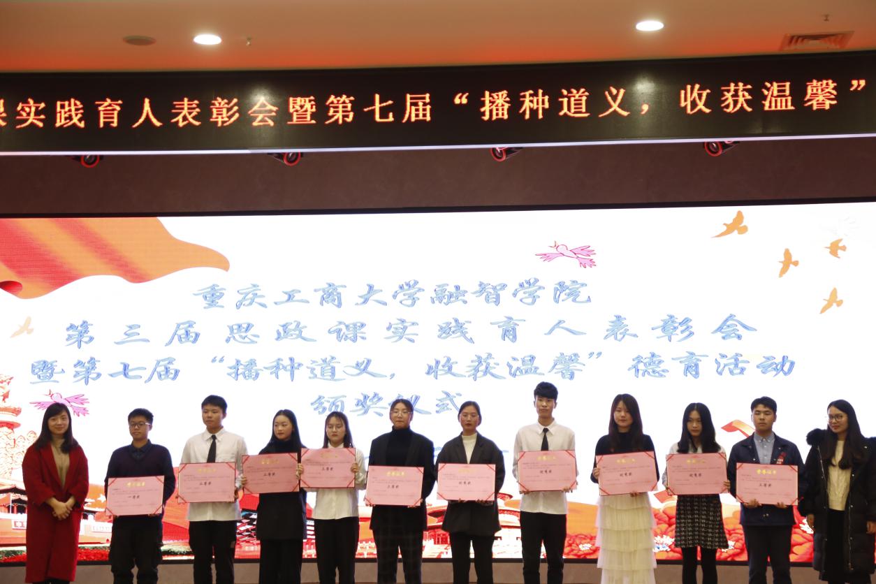 在庆祝新中国成立七十周年之际,为了大力推动思政教育“三个课堂联动”实践育人模式,表彰在思政教育教学中的先进个人,展示思政德育活动系列成果,2019年12月11日下午18:00,由重庆工商大学融智学院思政部、党群工作部、团委联合主办、管理工程学院承办的第三届思政课实践育人总结表彰会暨第七届“播种道义,收获温馨”系列德育活动颁奖仪式在融智学院学术报告厅成功举行。