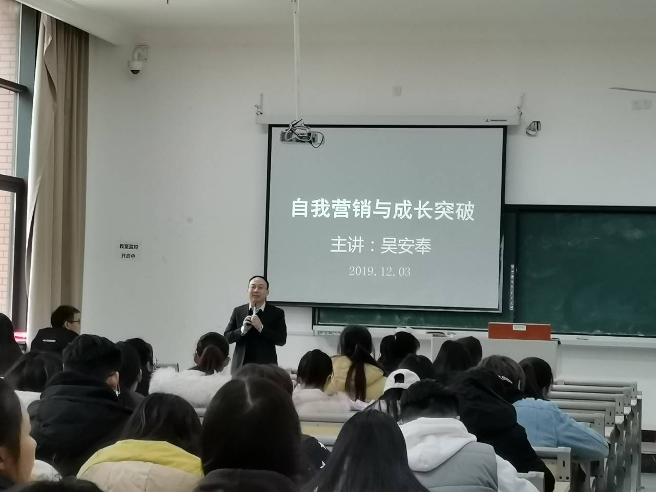 在“大学生自我营销与成长突破”讲座中,吴安奉老师从西游记中师徒四人的个人特点进行分析,引导同学们采用SWOT分析法对自己进行自我认知设计规划;通过对营销高手必备的五种素养的讲解,启迪同学们认识到“表达自己,与人沟通”能力的重要性;从心态管理、目标管理、时间管理、学习管理、知识管理教会同学们实现良好自我管理的方式方法,实现成长突破,为如花锦簇的未来铺好道路。