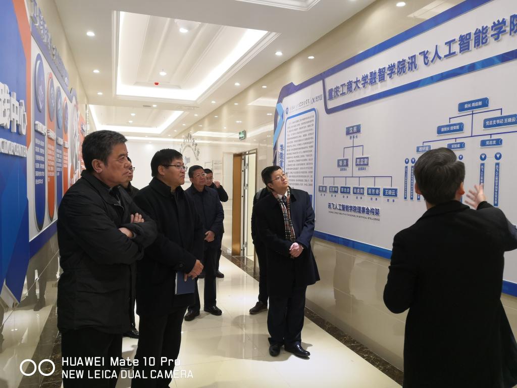 教育集团领导首先来到人工智能应用创新中心,该中心是由学校和科大讯飞股份有限公司联合打造,目前建设已经接近尾声。接下来,又来到讯飞人工智能学院,了解该学院探索理事会领导下的双院长负责制所做的探索和实践。最后,一行人来到重庆市重点实验室——生态环境空间信息数据挖掘与大数据集成实验室,查看了实验室的工作进展和工作情况。在现场调研过程中,集团领导和学校领导及讯飞人工智能学院院长周启刚、副院长田荣阳就项目进展情况、存在的困难进行了深入交流。