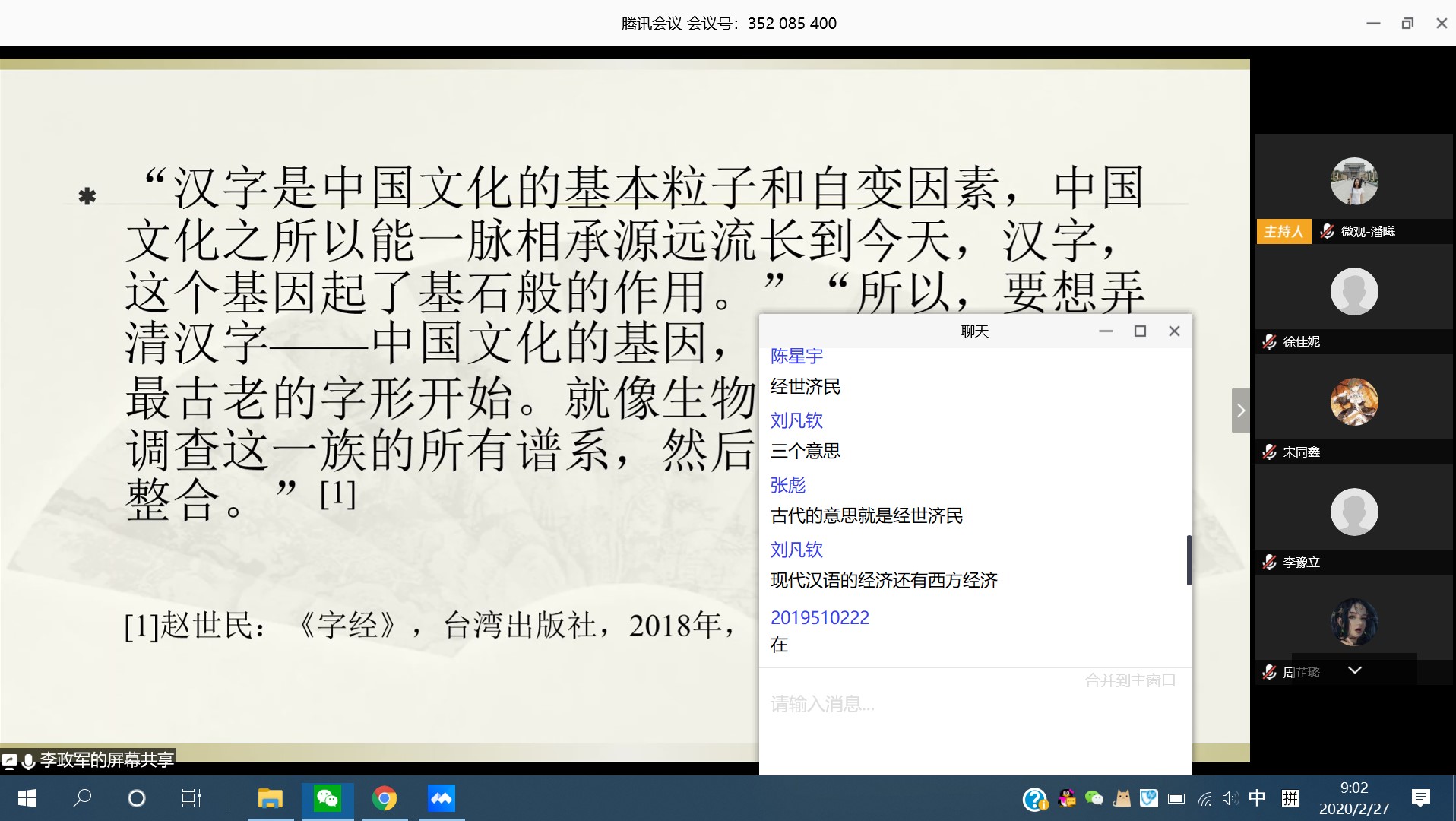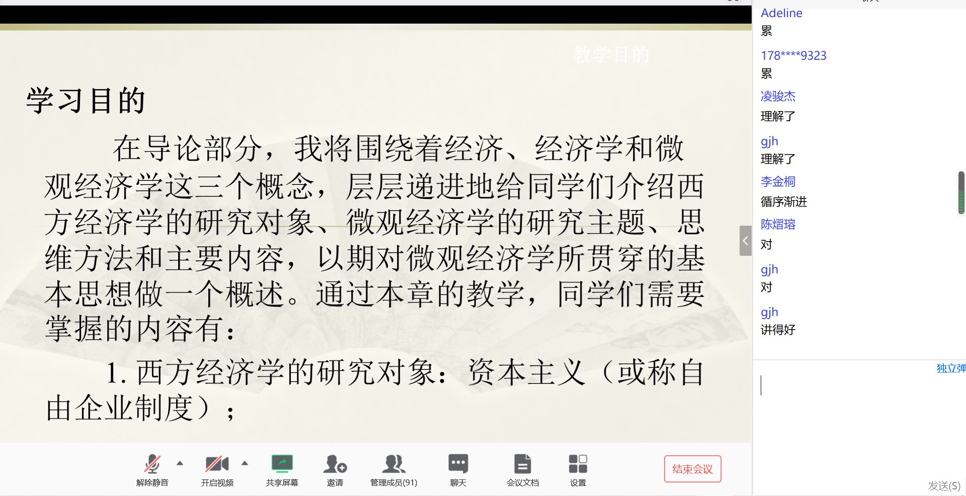 第一次联合教学选定在2月27日(周四),上午的1-3节课是李政军教授与潘曦老师为19级经济学2班的同学进行授课,下午的6-8节课是李政军教授与刘春兰老师为19级金融7班和8班的同学授课,采取腾讯会议在线直播方式讲解本课程“导论”部分知识。为更好地监测学生对《微观经济学在线课程》学习效果,李政军教授首先抽取了部分同学来回答本部分在线视频讲解的重要知识点,并根据学生回答情况,从中国汉字发展文化、经济一词发展的由来,并结合案例详细地为同学们讲解了本课程导论部分的“经济”、“经济学”、“微观经济学”三个重要概念,李政军教授以丰厚理论积淀、循序渐进的讲解方法,为同学们搭建起《微观经济学》的学习框架,使得在线教学学生参与度高(全勤)、课程活跃度高(见图2、图3),在讲解过程中纷纷获得学生好评(图4),在本课程内容讲解结束以后,潘曦老师与刘春兰老师分别就自己的授课班级本学期的授课要求、考核要求给大家作了说明。