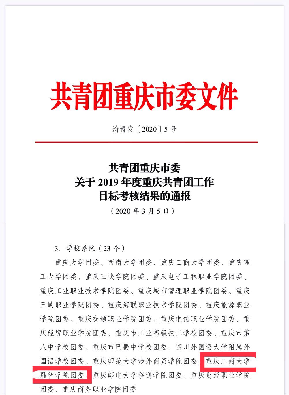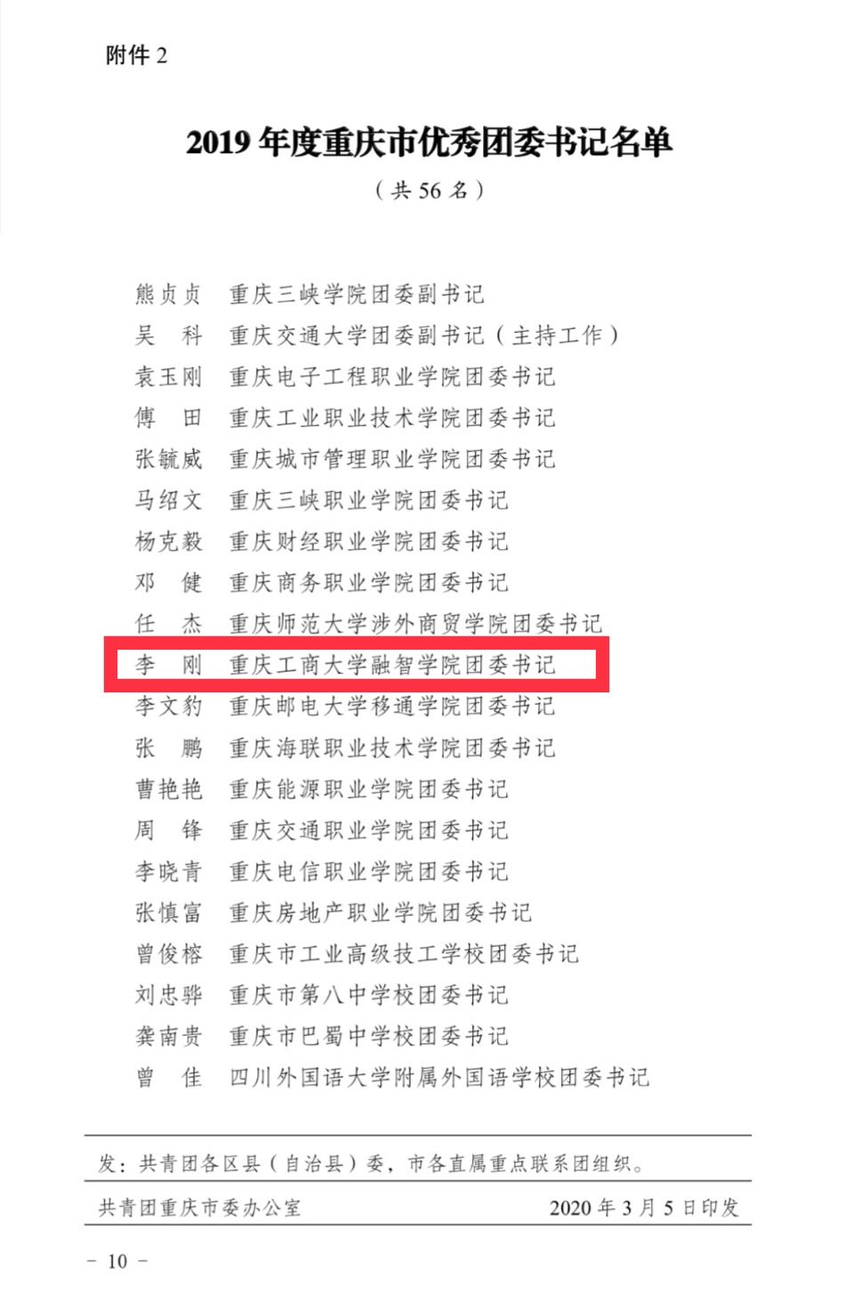 近日,共青团重庆市委下发了《关于2019年度共青团工作目标考核结果的通报》(渝青发〔2020〕5号),我校在2019年度重庆市共青团工作目标考核中成绩优异,考核结果为“特等团组织”,这也是我校继2018年后再次荣获目标考核“特等奖”。我校团委书记李刚荣获“2019年度重庆市优秀团委书记”荣誉称号。