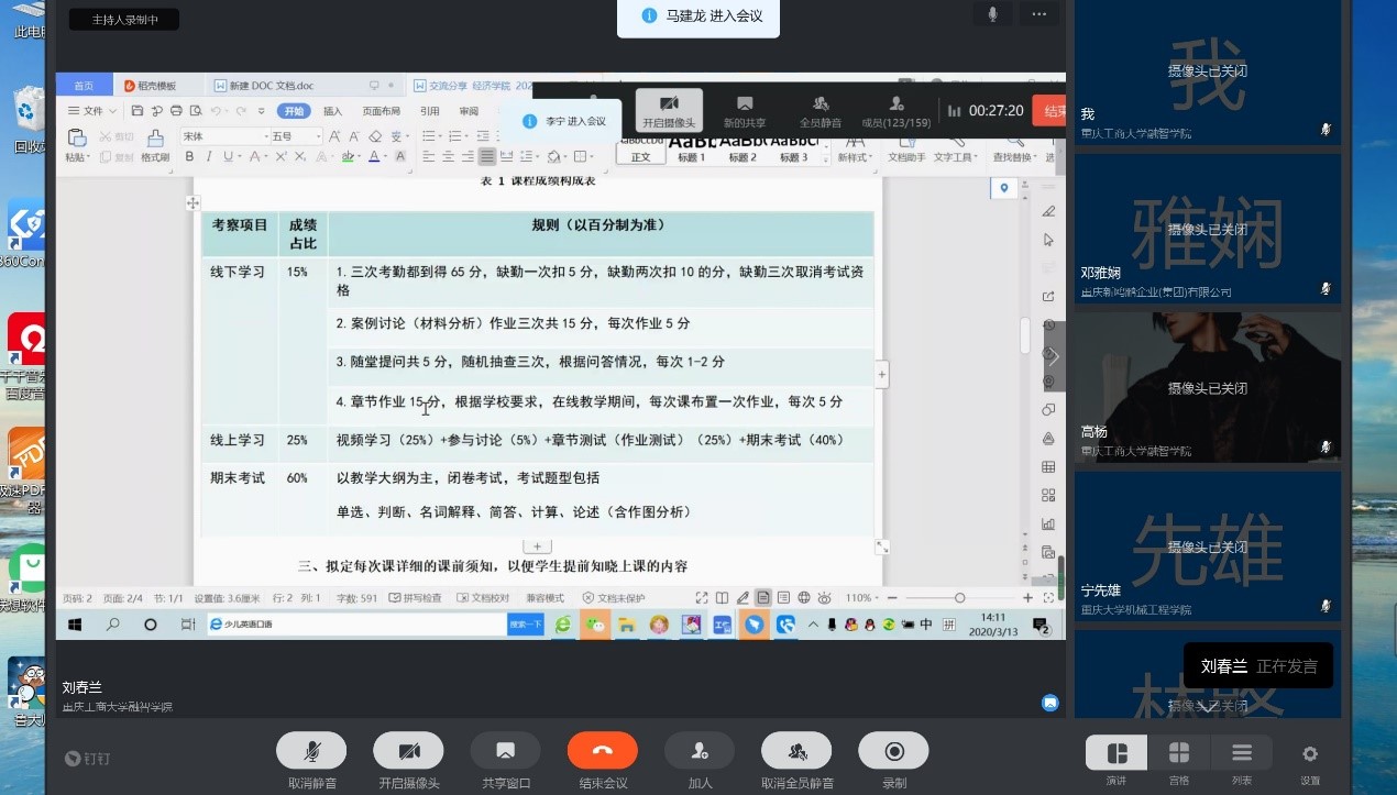 为更好地落实教育部和重庆市教委关于“停课不停教、停课不停学”的指示,在校领导的指导下,2020年3月13日下午,教务处教师发展中心组织全校教师开展了“线上教学交流分享会”。本次会议采用钉钉群视频会议的方式进行,共147名教师全程参加。刘春兰等10位老师分享了自身及教学团队的线上教学经验,各参会教师认真聆听,努力总结汲取经验以进一步提升线上教学效果,保障学校人才培养质量。