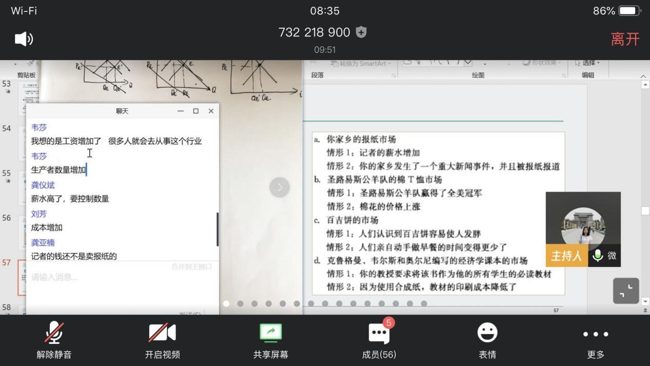 潘曦老师本次授课是在腾讯会议进行的,在课前要求学生在智慧树平台完成了相关知识点的慕课学习,课堂直播的主要内容是先做了一个关于“均衡价格”的模拟练习,然后是对“当前国际原油市场”和“药房常用药价格上涨”两个真实案例分析。在整个教学过程中,潘老师通过翻转课堂的方式积极引导学生用所学知识对现实生活中出现的问题进行深度解析,给予学生充分的时间进行问题思考,并熟练使用腾讯会议和QQ群的切换及时了解学生课堂反馈,调整课堂教学节奏。